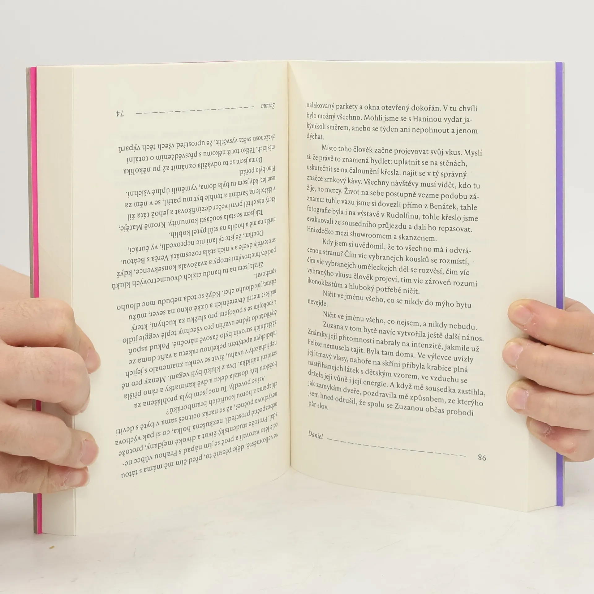 Experimentální román ze současnosti. Daniel vlastní byt v Táboře, ale pracuje v Praze a domů jezdí jen na víkendy. Zuzana odešla od přítele a nemá dost peněz, takže uvítá nájem aspoň na všední dny. Ty dva nespojuje nic než prostor, který každý po svém obývají, a ten prostor je zároveň rozděluje. Jak by vlastně dva lidé mohlimít něco společného? On se stará o umírajícího otce, péče o hrany života však zbude vždycky na ni. Jemu zalehlo srdce, ona má šelest na mozku. Dva příběhy ze současnosti, které se dotýkají a zároveň míjejí, dvě samomluvy, které se až díky čtenáři mohou stát rozhovorem. Jana Šrámková a Jan Němec našli nezvyklý způsob, jak napsat knihu dohromady a zároveň každý zvlášť. Výsledkem je originální román, který lze číst z jedné nebo druhé strany, anebo třeba na přeskáčku. Není to však literární hra, ale osudová volba: na směru čtení nezávisí nic menšího než Danielova a Zuzanina budoucnost. Není však život nakonec palindrom? V elipse spí lev, říká Daniel. Uchem v mechu, odpovídá Zuzana.