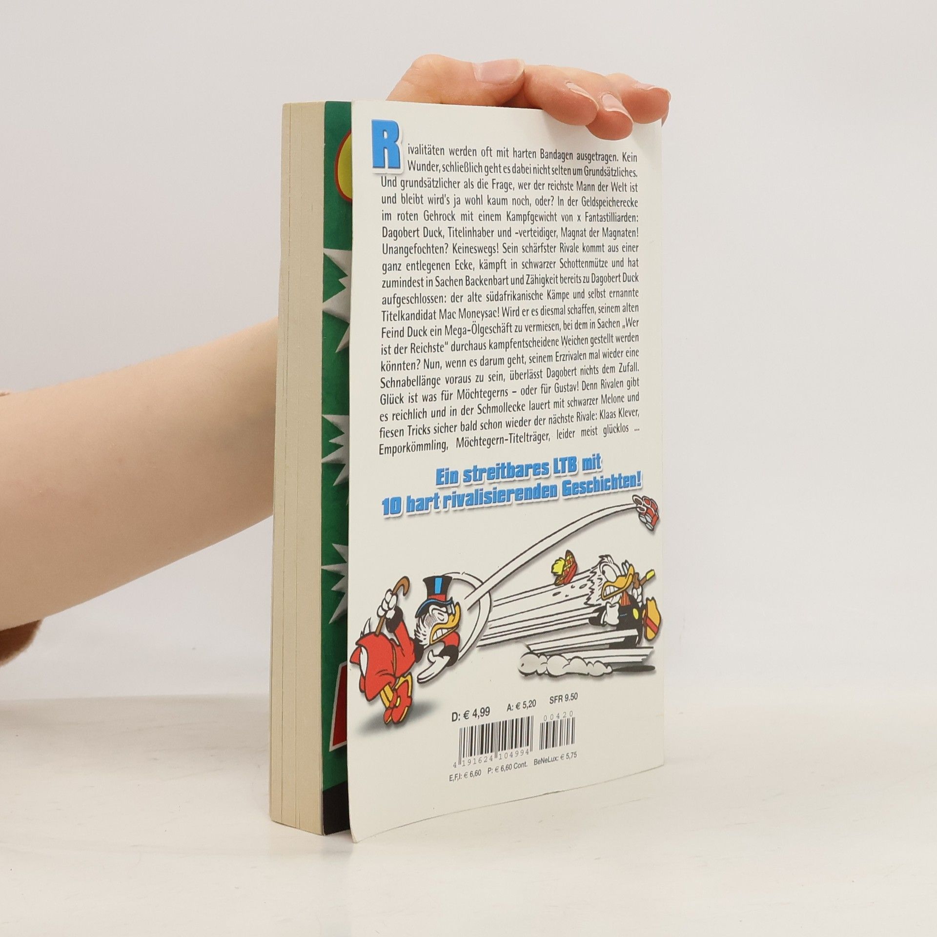 Rivalitäten werden oft mit harten Bandagen ausgetragen. Kein Wunder, schließlich geht es dabei nicht selten um Grundsätzliches. Und grundsätzlicher als die Frage, wer der reichste Mann der Welt ist und bleibt wird’s ja wohl kaum noch, oder? In der Geldspeicherecke im roten Gehrock mit einem Kampfgewicht von x Fantastilliarden: Dagobert Duck, Titelinhaber und -verteidiger, Magnat der Magnaten! Unangefochten? Keineswegs! Sein schärfster Rivale kommt aus einer ganz entlegenen Ecke, kämpft in schwarzer Schottenmütze und hat zumindest in Sachen Backenbart und Zähigkeit bereits zu Dagobert Duck aufgeschlossen: der alte südafrikanische Kämpe und selbst ernannte Titelkandidat Mac Moneysac! Wird er es diesmal schaffen, seinem alten Feind Duck ein Mega-Ölgeschäft zu vermiesen, bei dem in Sachen „Wer ist der Reichste“ durchaus kampfentscheidene Weichen gestellt werden könnten? Nun, wenn es darum geht, seinem Erzrivalen mal wieder eine Schnabellänge voraus zu sein, überlässt Dagobert nichts dem Zufall. Glück ist was für Möchtegerns – oder für Gustav! Denn Rivalen gibt es reichlich und in der Schmollecke lauert mit schwarzer Melone und fiesen Tricks sicher bald schon wieder der nächste Rivale: Klaas Klever, Emporkömmling, Möchtegern-Titelträger, leider meist glücklos ...Ein streitbares LTB mit 10 hart rivalisierenden Geschichten!
