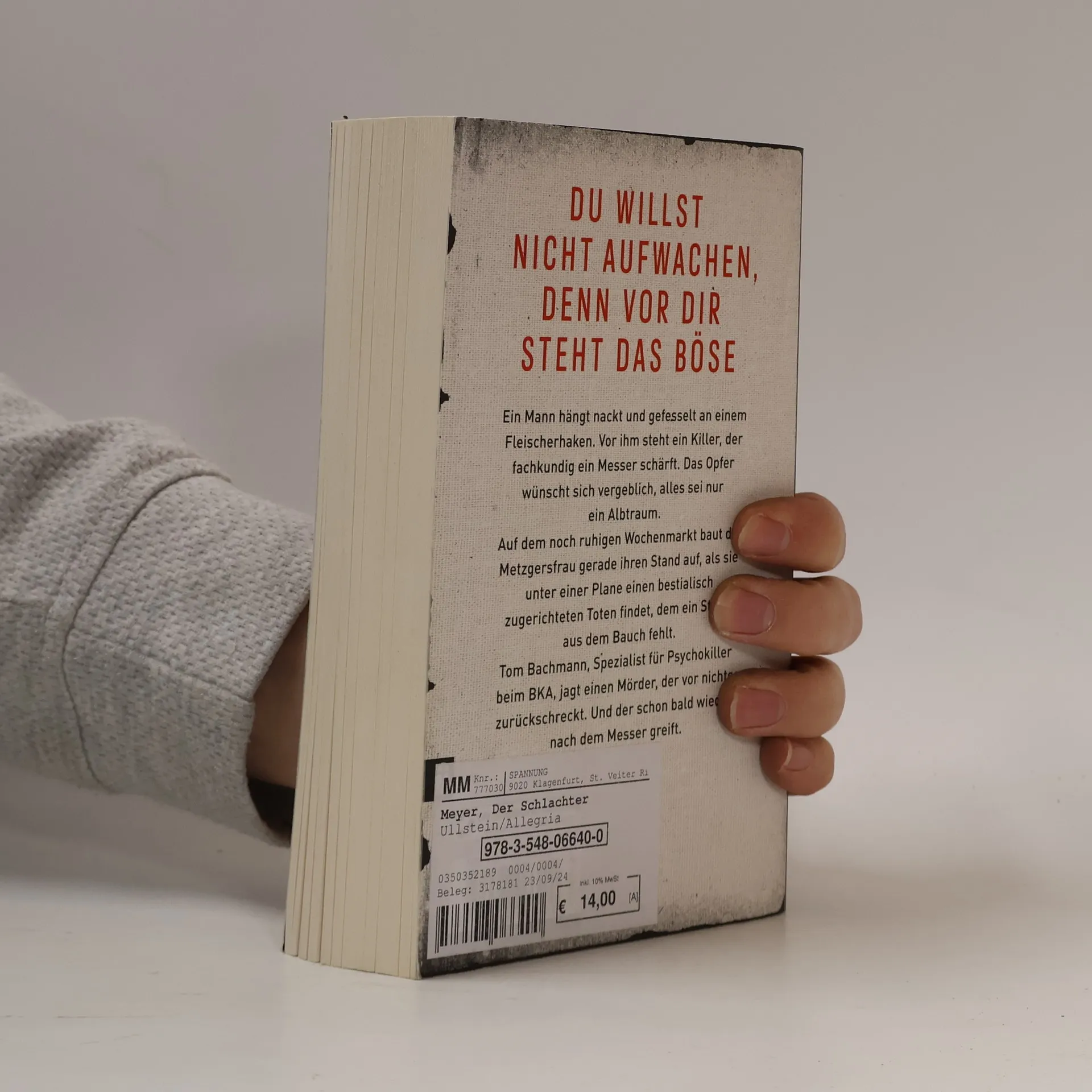Du willst nicht aufwachen, denn vor dir steht das Böse Ein Mann hängt nackt und gefesselt an einem Fleischerhaken. Vor ihm steht ein Killer, der fachkundig ein Messer schärft. Das Opfer wünscht sich vergeblich, alles sei nur ein Albtraum. Auf dem noch ruhigen Wochenmarkt baut die Metzgersfrau gerade ihren Stand auf, als sie unter einer Plane einen bestialisch zugerichteten Toten findet, dem ein Stück aus dem Bauch fehlt. Tom Bachmann, Spezialist beim BKA für gestörte Psychokiller, jagt einen Mörder, der vor nichts zurückschreckt. Und der schon bald wieder nach dem Messer greift.