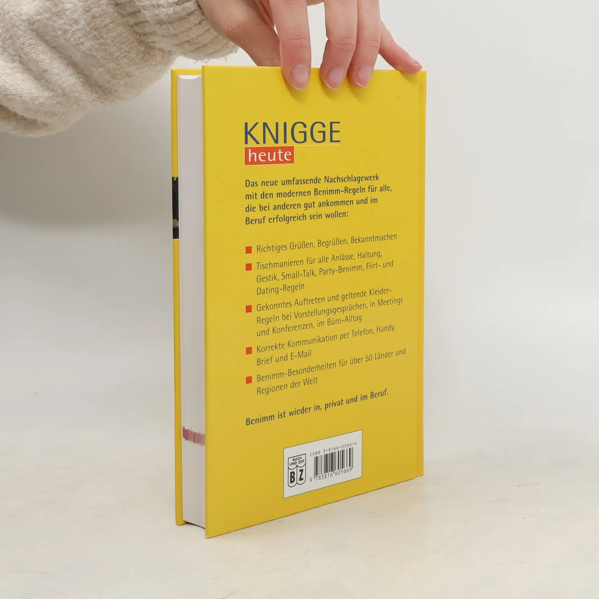 Nach Jahren des Laissez-faire gelten gutes Benehmen und gewandtes Auftreten wieder als gefragt. Dieser zeitgemäße und praxisorientierte Ratgeber vermittelt die gültigen Benimmregeln auf verständliche Weise, räumt mit falschen Vorstellungen über korrektes Verhalten in allen denkbaren Situationen auf und begleitet den Leser auch auf internationalem Parkett. Das Werk gliedert sich in die vier großen Kapitel Benimm-Basics, Benimmprofis privat, Benimm im Business sowie Benimm weltweit. Erste-Hilfe-Tipps, falls doch mal ein Fauxpas passiert, sowie To-Do- und Tabu-Listen für den schnellen Überblick runden das Werk ab.