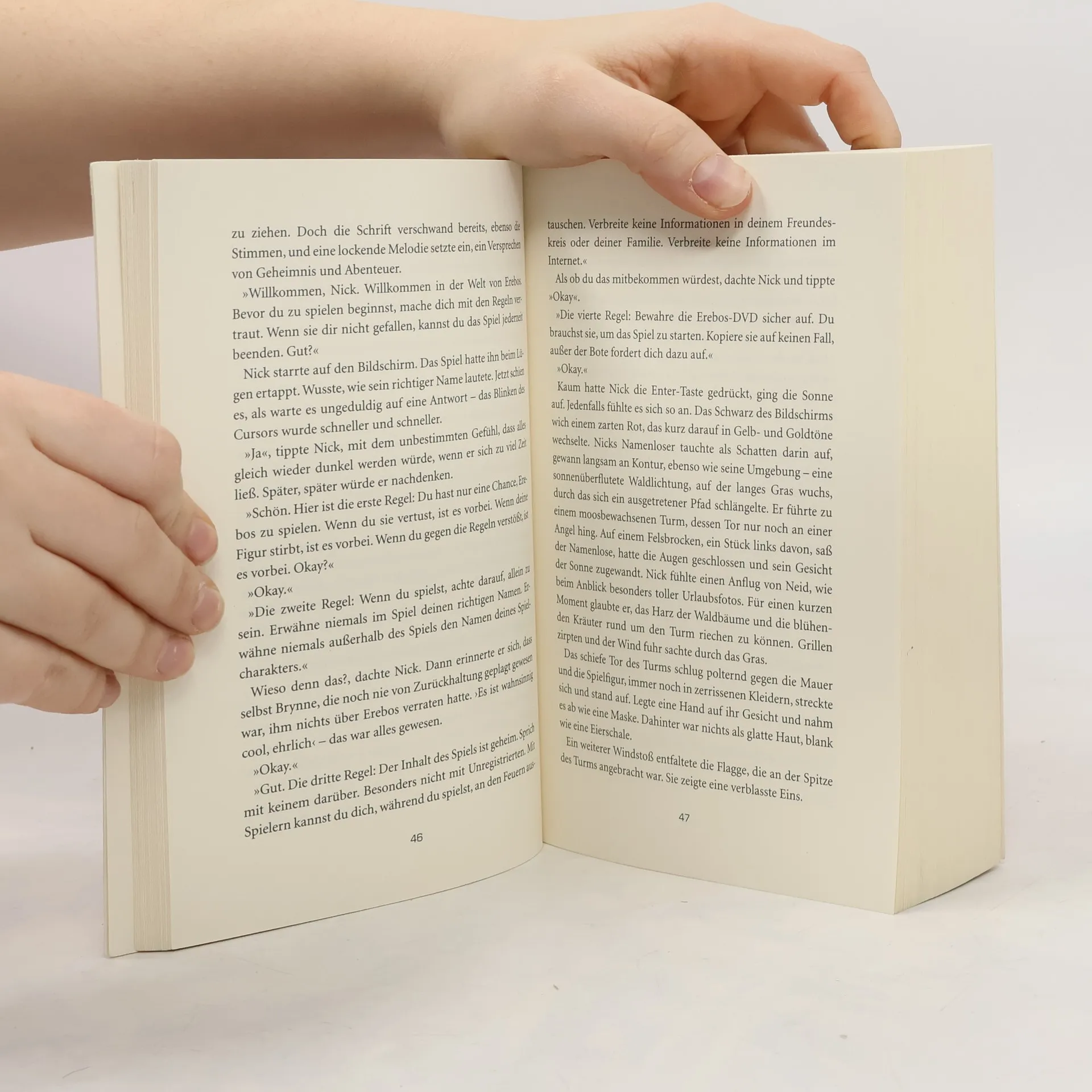 In einer Londoner Schule wird ein Computerspiel namens Erebos verbreitet, das die Spieler in seinen Bann zieht. Die strengen Regeln erlauben nur eine Chance, und es ist verboten, mit anderen darüber zu sprechen oder gemeinsam zu spielen. Wer gegen die Regeln verstößt oder seine Aufgaben nicht erfüllt, wird ausgeschlossen und kann das Spiel nicht mehr starten. Erebos verwischt die Grenzen zwischen Fiktion und Realität, da die Aufgaben des Spiels in der echten Welt ausgeführt werden müssen. Auch Nick wird von Erebos gefesselt, bis das Spiel ihm befiehlt, einen Menschen zu töten. Die Autorin, bekannt für ihre Jugendromane und Thriller, behandelt in ihrem Debüt im Jugendbuch das Thema Online-Rollenspiele. Der fesselnde Roman thematisiert die Gefahren virtueller Welten und deren Suchtpotenzial. Erebos wurde in über dreißig Sprachen übersetzt und erhielt zahlreiche Auszeichnungen, darunter den Deutschen Jugendliteraturpreis. Weitere Informationen sind auf der Website der Autorin verfügbar.