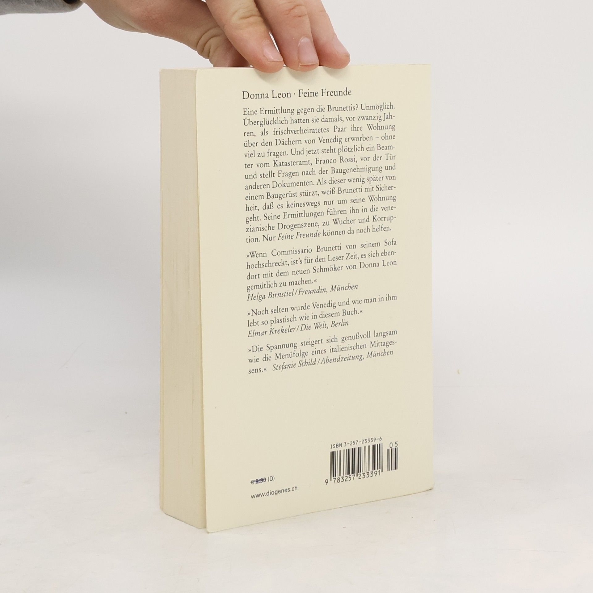 Eine Ermittlung gegen Brunetti? Unmöglich. Zwar geht es nur um seine Eigentumswohnung und die Baubewilligung, doch Brunetti muß das Schlimmste befürchten. Als der zuständige Beamte wenig später von einem Baugerüst stürzt, weiß Brunetti mit Sicherheit, daß es in diesem Fall keineswegs nur um seine eigene Wohnung geht. Seine Ermittlungen führen Brunetti in die venezianische Drogenszene, zu Wucher und Korruption. Nur Feine Freunde können da noch helfen.