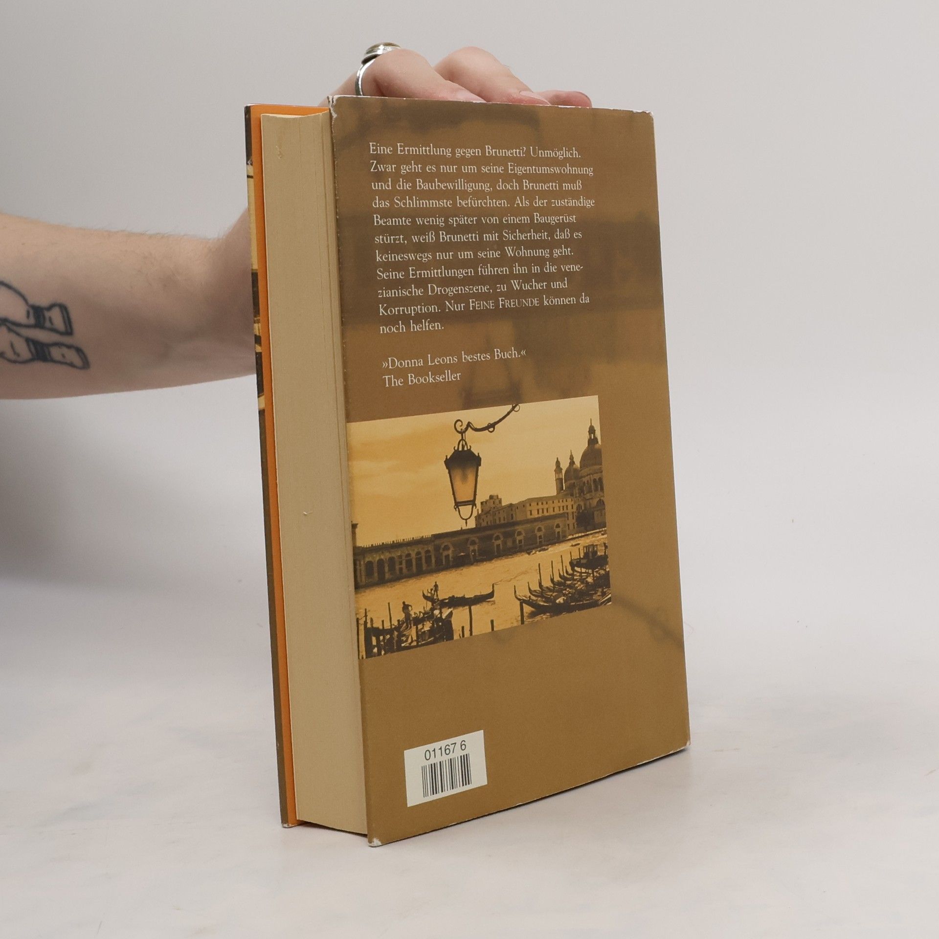 Eine Ermittlung gegen Brunetti? Unmöglich. Zwar geht es nur um seine Eigentumswohnung und die Baubewilligung, doch Brunetti muß das Schlimmste befürchten. Als der zuständige Beamte wenig später von einem Baugerüst stürzt, weiß Brunetti mit Sicherheit, dass es keineswegs nur um seine Wohnung geht. Seine Ermittlungen führen ihn in die venezianische Drogenszene, zu Wucher und Korruption. Nur FEINE FREUNDE können da noch helfen.