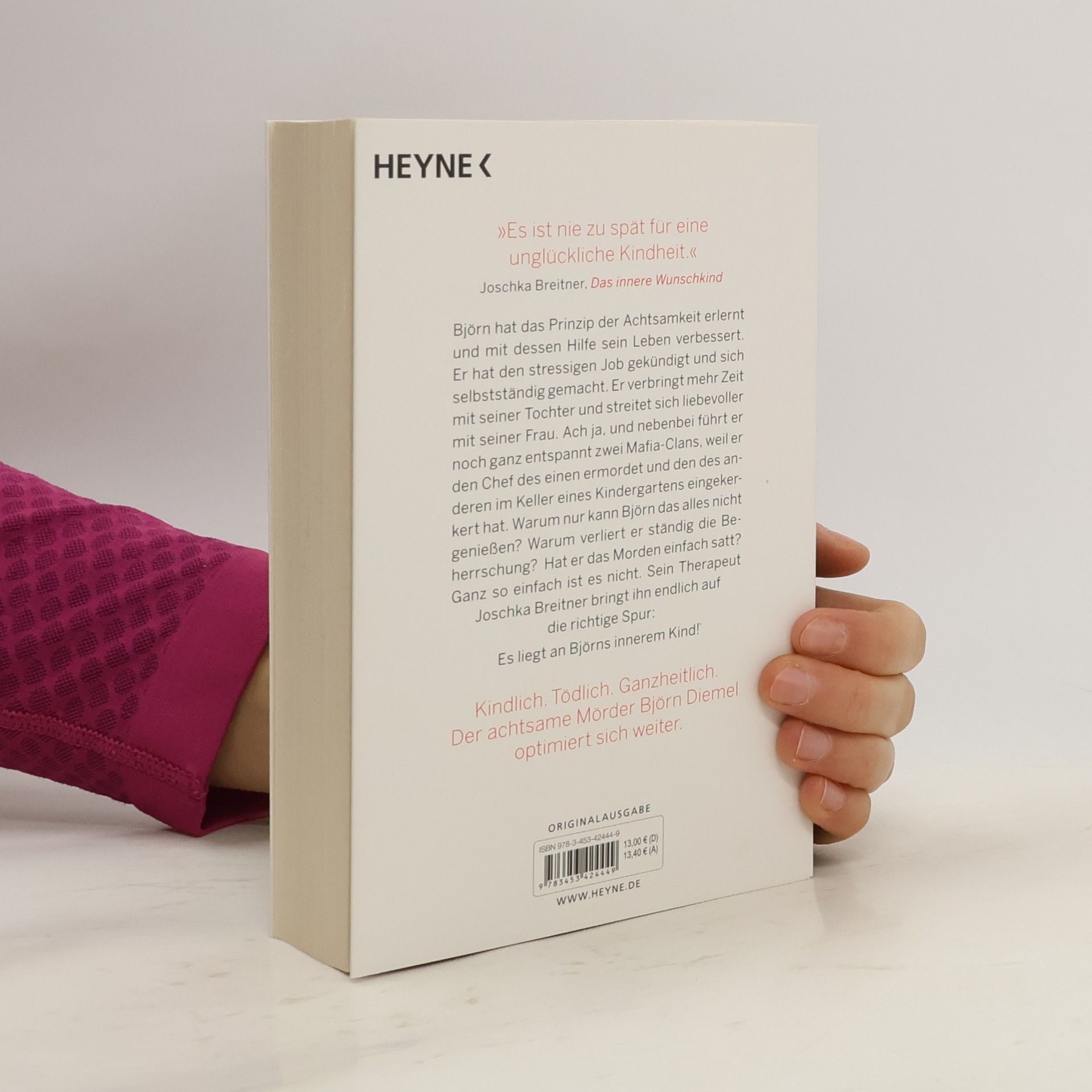 Björn Diemel ist zurück – und mordet ganzheitlicher als je zuvor Björn Diemel hat die Prinzipien der Achtsamkeit erlernt, und mit ihrer Hilfe sein Leben verbessert. Er hat den stressigen Job gekündigt und sich selbstständig gemacht. Er verbringt mehr Zeit mit seiner Tochter und streitet sich in der Regel liebevoller mit seiner Frau. Ach ja, und nebenbei führt er noch ganz entspannt zwei Mafia-Clans, weil er den Chef des einen ermordet und den des anderen im Keller eines Kindergartens eingekerkert hat. Warum nur kann Björn das alles nicht genießen? Warum verliert er ständig die Beherrschung? Hat er das Morden einfach satt? Ganz so einfach ist es nicht. Sein Therapeut Joschka Breitner bringt ihn endlich auf die richtige Spur: Es liegt an Björns innerem Kind!