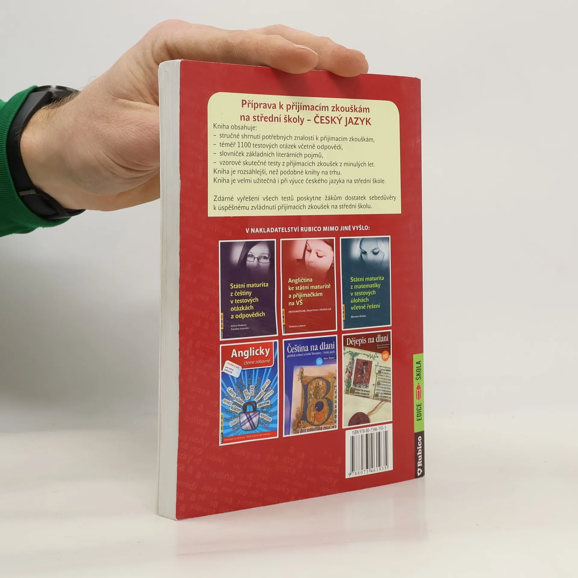 Kniha obsahuje: - stručné shrnutí potřebných znalostí k přijímacím zkouškám, - téměř 1100 testových otázek včetně odpovědí, - slovníček základních literárních pojmů. Kniha je rozsáhlejší, než podobné knihy na trhu. Kniha obsahuje vzorové skutečné testy z přijímacích zkoušek z minulých let. Kniha je velmi užitečná i při výuce českého jazyka na střední škole. Zdárné vyřešení všech testů poskytne žákům dostatek sebedůvěry k úspěšnému zvládnutí přijímacích zkoušek na střední školu.