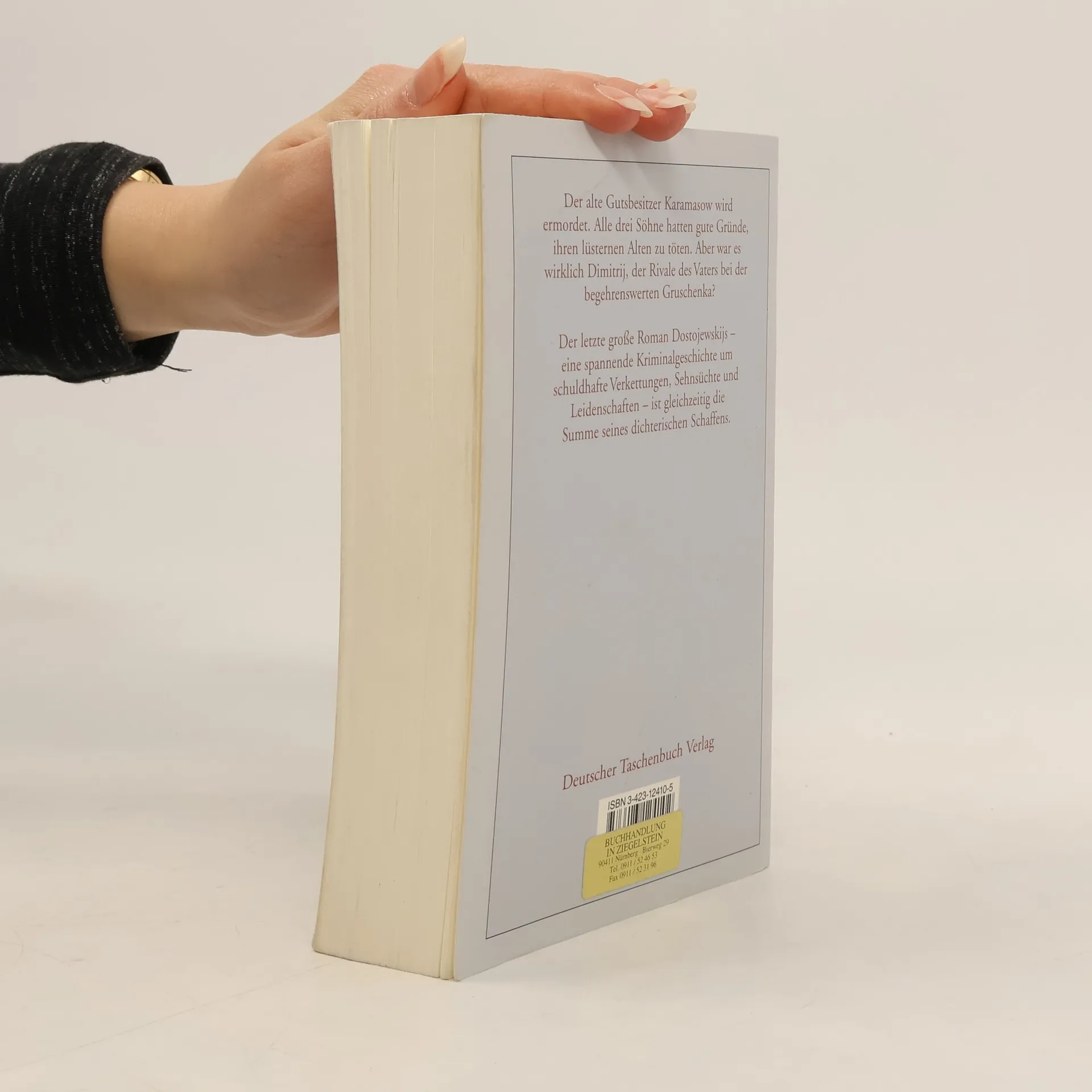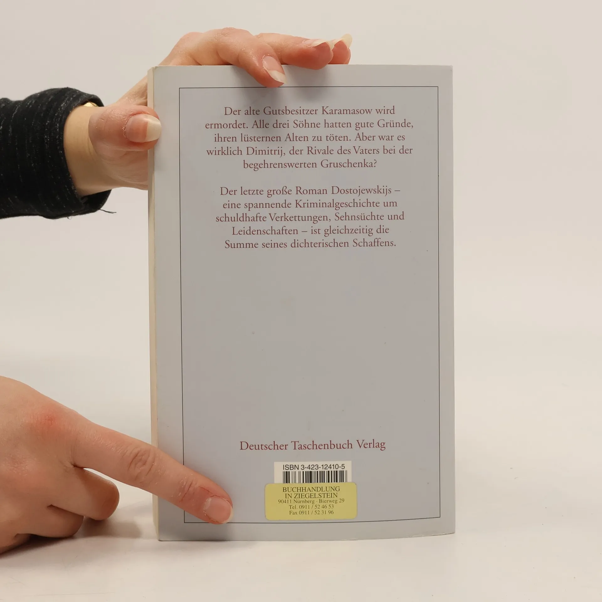 Dostojewsksijs letzter großer Roman Die drei Söhne des lüsternen und närrischen alten Karamasow kehren in das Elternhaus zurück. Voll Hass und Verachtung wünschen sie seinen Tod herbei, und kurz danach wird der Vater tatsächlich ermordet aufgefunden. Alles deutet auf Dimitrij hin, den ältesten Sohn und Rivalen des Vaters bei der begehrenswerten Gruschenka. So beginnt die berühmte Kriminalgeschichte, die den Leser auf vielen Seiten- und Irrwegen immer tiefer in die Verstrickungen von Verbrechen und Schuld mit hineinzieht, und erst am Ende kommt die Auflösung. Doch im Mittelpunkt steht nicht das kriminelle Delikt als solches: es sind die tragischen Konflikte der Brüder, von denen jeder ein Lebensprinzip verkörpert, das in einem fortschreitenden Erkenntnisprozess infrage gestellt wird.