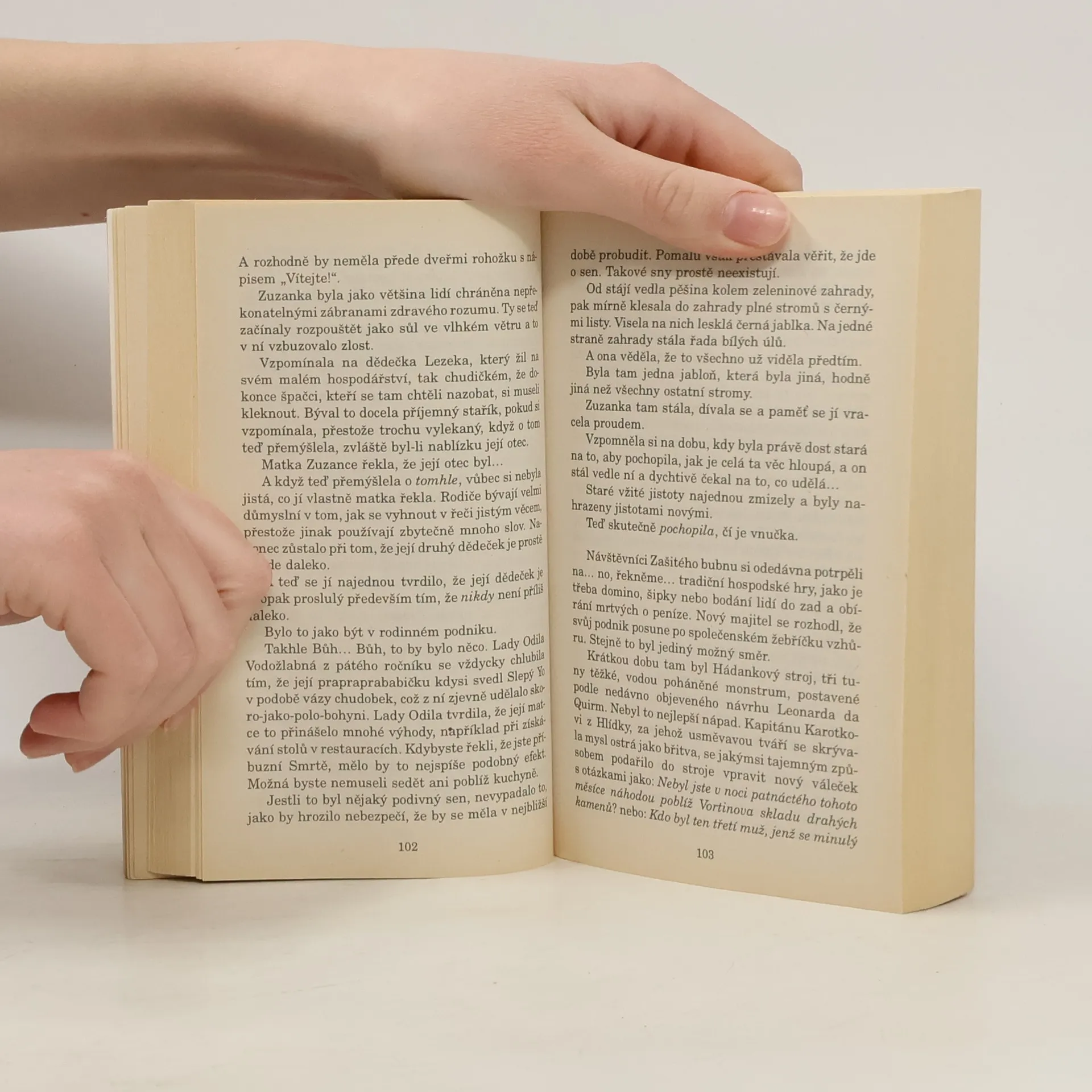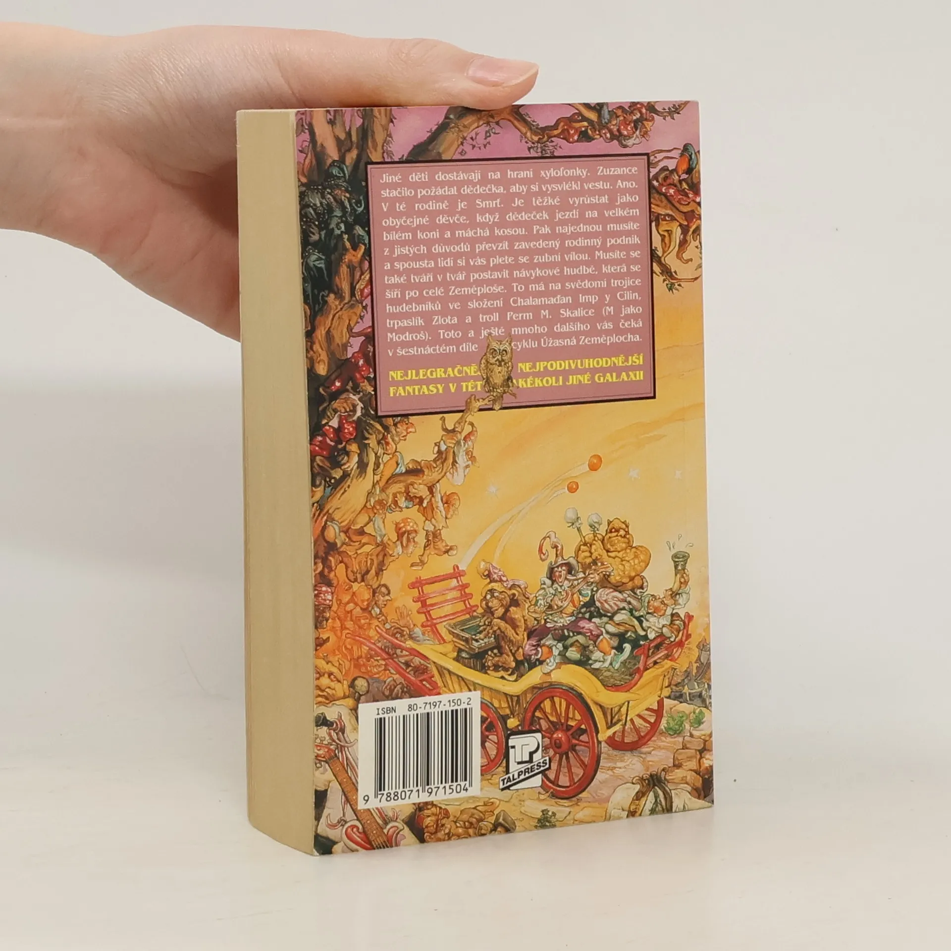 Jiné děti dostávají na hraní xylofonky. Zuzance stačilo požádat dědečka, aby si vysvlékl vestu. Ano. V té rodině je Smrť. Je těžké vyrůstat jako obyčejné děvče, když dědeček jezdí na velkém bílém koni a máchá kosou. Pak najednou z jistých důvodů musíte převzít zavedený rodinný podnik a spousta lidí si vás plete se zubní vílou. Musíte se také v tváří v tvář postavit návykové hudbě, která se šíří po celé Zeměploše. To má na svědomí trojice hudebníků ve složení Chalamaďan Imp y Cilin, trpaslík Zlota a troll Perm M. Skalice (M jako Modroš). Úžasná Zeměplocha, kniha 16., přeložil Jan Kantůrek.