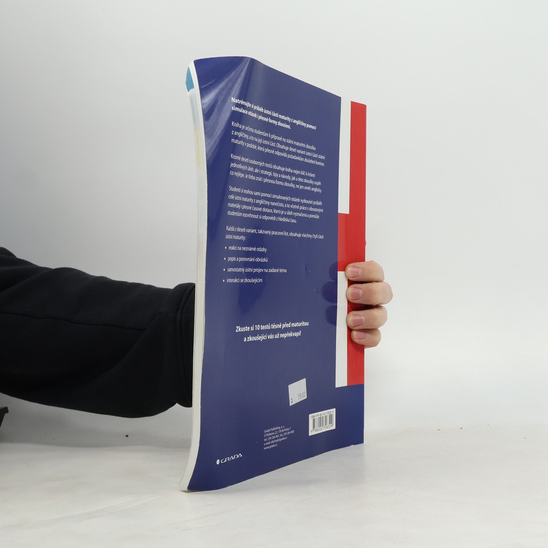 Natrénujte si průběh ústní části maturity z angličtiny pomocí simulace otázek i přesné formy zkoušení. Kniha je určena studentům k přípravě na státní maturitní zkoušku z angličtiny, a to na její ústní část. Obsahuje deset variant ústní části státní maturity v podobě, která přesně odpovídá požadavkům zkušební komise. Kromě deseti souborných testů obsahuje kniha nejen klíč k řešení jednotlivých úloh, ale i strategii, tipy a návody, jak u této zkoušky uspět co nejlépe. Je třeba znát i přesnou formu zkoušky, ne jen umět anglicky. Studenti si mohou sami pomocí simulovaných otázek vyzkoušet průběh celé ústní maturity z angličtiny nanečisto, a to včetně práce s obrazovými materiály i přesné časové dotace, která je u úloh vyznačená a pomůže studentům rozvrhnout si odpovědi z hlediska času. Každá z deseti variant, takzvaný pracovní list, obsahuje všechny čtyři části ústní maturity: • reakci na neznámé otázky • popis a porovnání obrázků • samostatný ústní projev na zadané téma • interakci se zkoušejícím Zkuste si 10 testů těsně před maturitou a zkoušející vás už nepřekvapí!