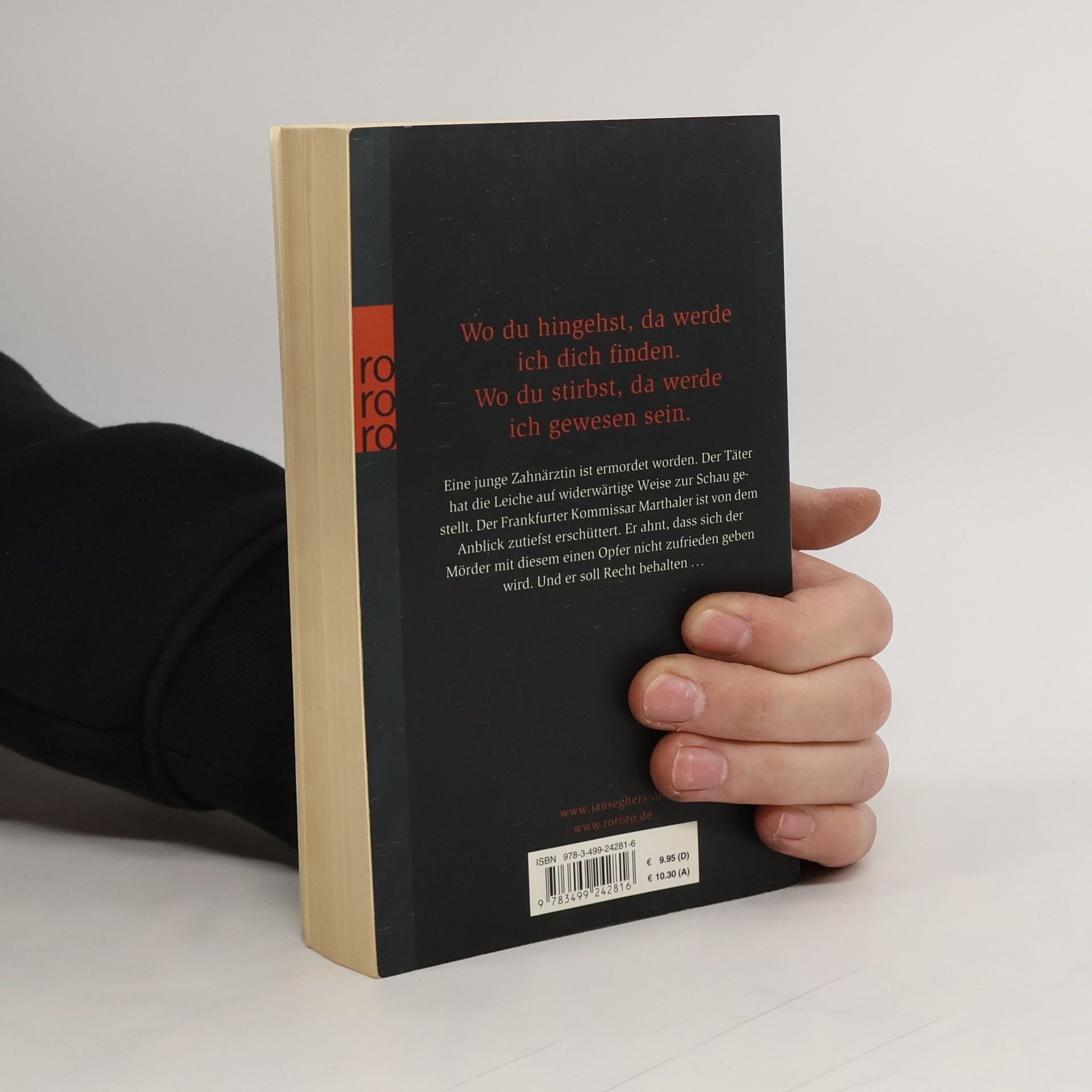 Wo du hingehst, da werde ich dich finden. Wo du stirbst, da werde ich gewesen sein.Eine junge Zahnärztin ist ermordet worden. Der Täter hat die Leiche auf widerwärtige Weise zur Schau gestellt. Der Frankfurter Kommissar Marthaler ist von dem Anblick zutiefst erschüttert. Er ahnt, dass sich der Mörder mit diesem einen Opfer nicht zufrieden geben wird.Und er soll Recht behalten ...www. janseghers. de