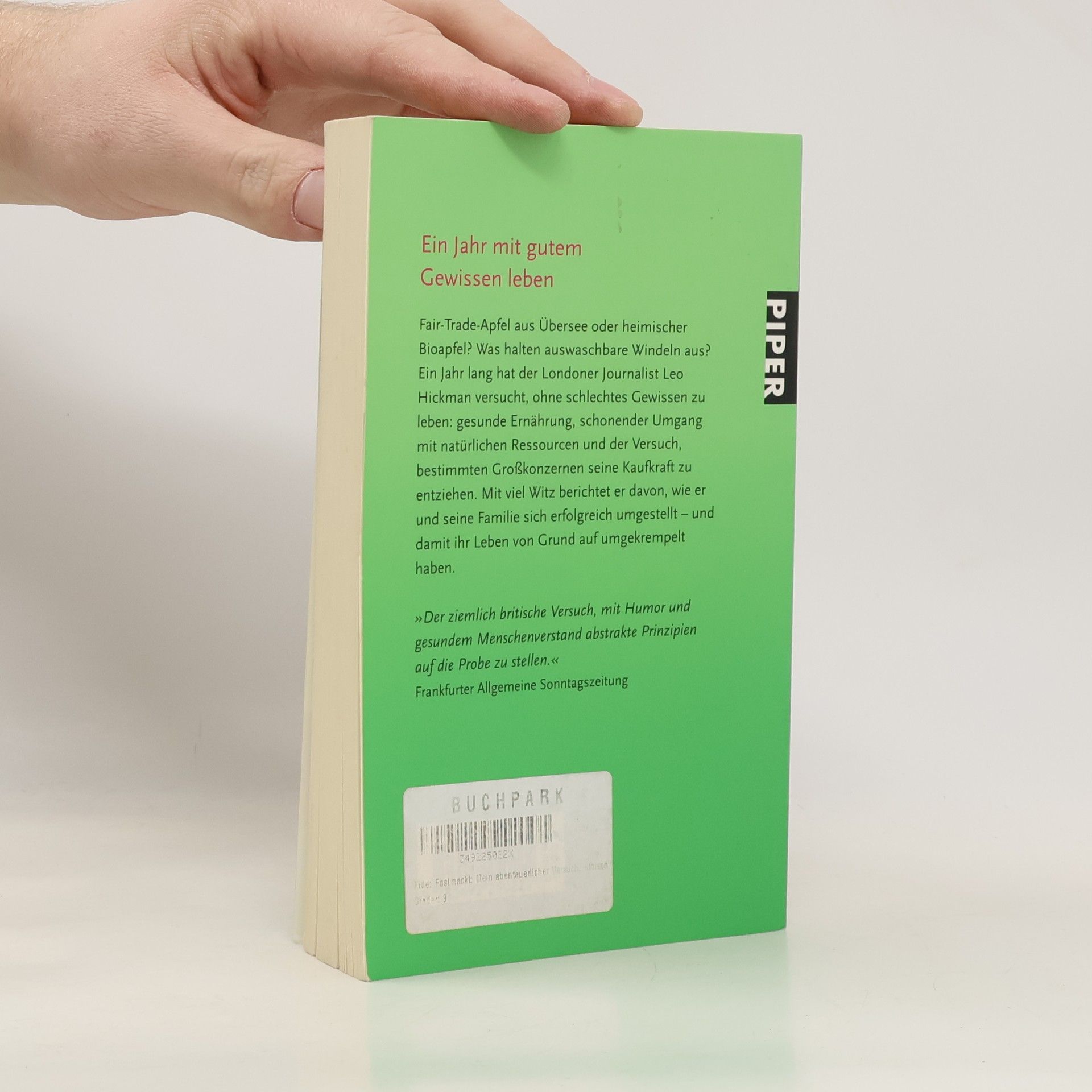 Fair-Trade-Apfel aus Übersee oder heimischer Bioapfel? Was halten auswaschbare Windeln aus? Ein Jahr lang hat der Londoner Journalist Leo Hickman versucht, ohne schlechtes Gewissen zu leben: gesunde Ernährung, schonender Umgang mit natürlichen Ressourcen und der Versuch, bestimmten Großkonzernen seine Kaufkraft zu entziehen. Mit viel Witz berichtet er davon, wie er und seine Familie sich erfolgreich umgestellt – und damit ihr Leben von Grund auf umgekrempelt haben.