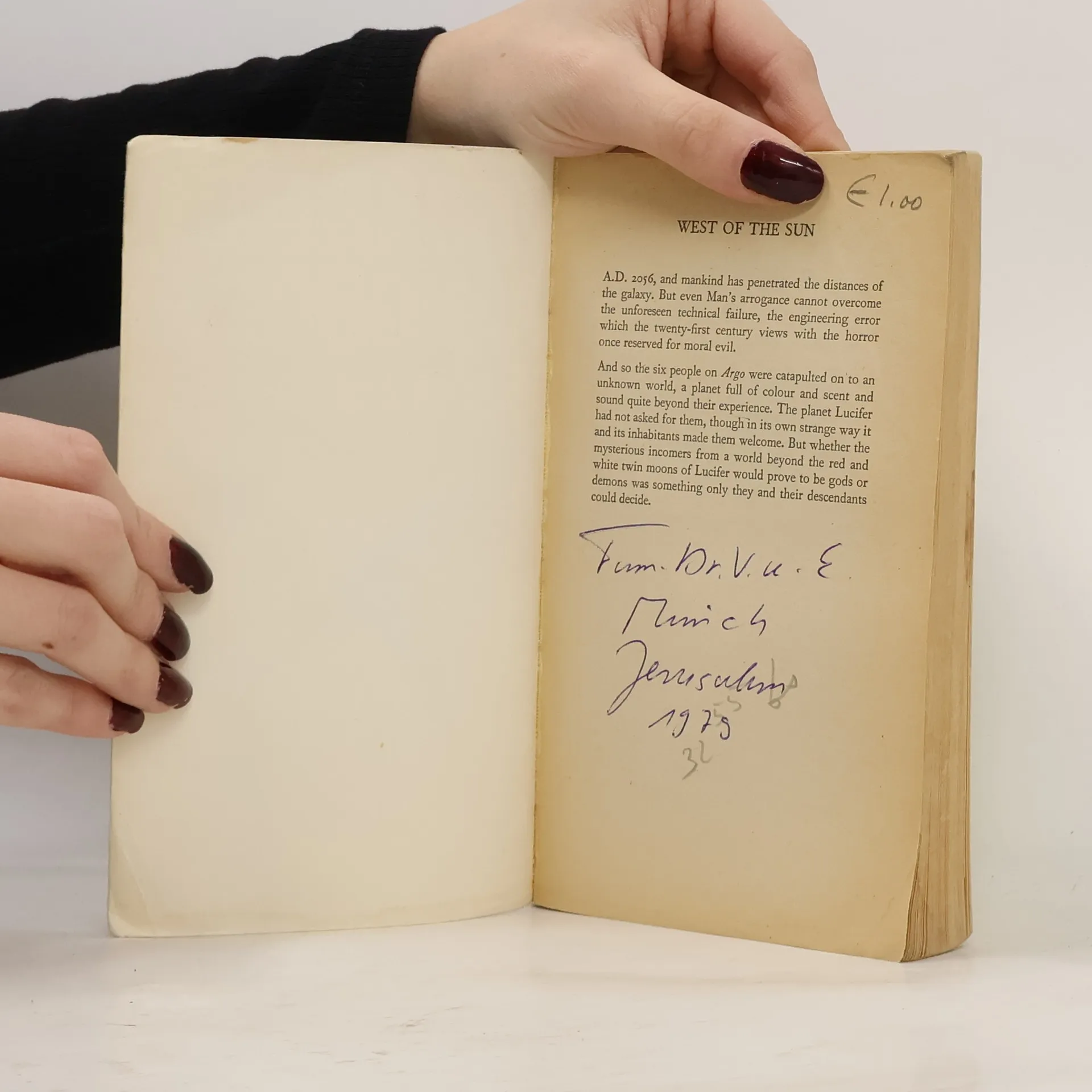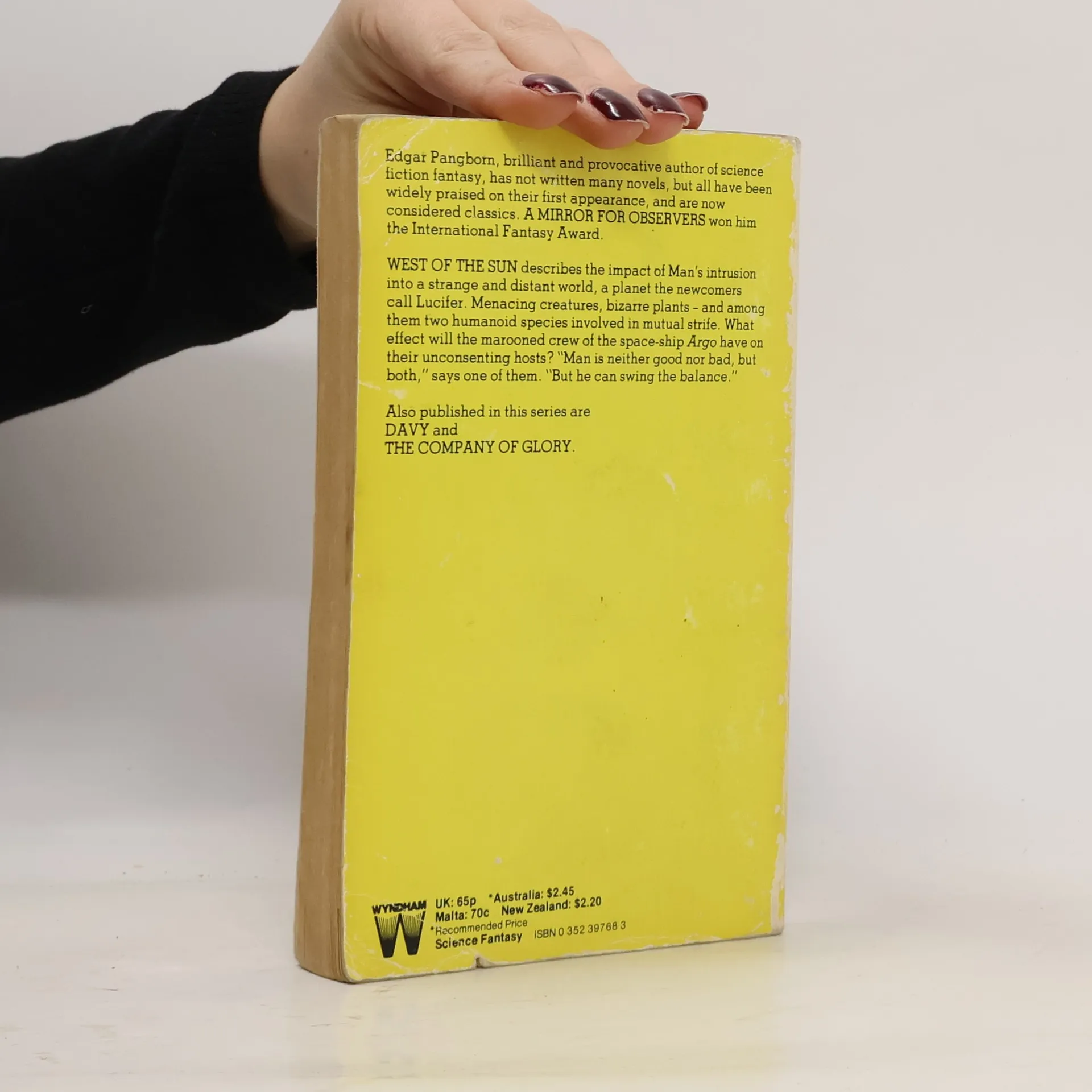 After eleven years in space, the Argo landed... West of the Sun ...on the dangerous, unknown planet Lucifer. The crew faced an untamed world of huge, carnivorous birds with wolverine heads and flashing black teeth; furred, ten-foot-tall men; & red-skinned, man-eating pygmies. They fought for mere survival, but—their duty was to colonize and populate the planet—four men and only two women.