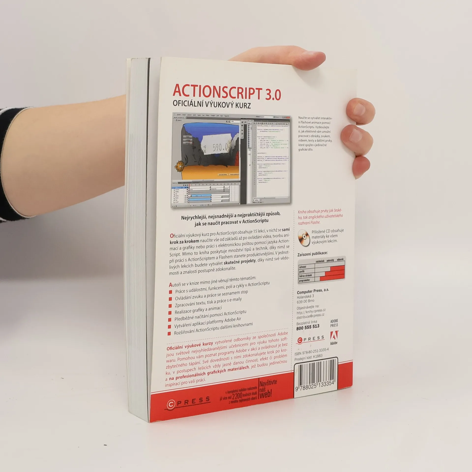 Oficiální výukový kurz pro ActionScript obsahuje 15 lekcí, v nichž se sami krok za krokem naučíte vše od základů až po ovládání videa, tvorbu animací a grafiky nebo práci s elektronickou poštou pomocí jazyka ActionScript. Mimo to kniha poskytuje množství tipů a technik, díky nimž se při práci s ActionScriptem a Flashem stanete produktivnějšími. V jednotlivých lekcích budete vytvářet skutečné projekty, díky nimž své vědomosti a znalosti postupně zdokonalíte. Autoři se v knize mimo jiné věnují těmto tématům: - Práce s událostmi, funkcemi, poli a cykly v ActionScriptu - Ovládání zvuku a práce se seznamem stop - Zpracování textu, tisk a práce s e-maily - Realizace grafiky a animací - Předběžné načítání pomocí ActionScriptu - Vytváření aplikací platformy Adobe Air - Rozšiřování ActionScriptu dalšími knihovnami Oficiální výukové kurzy vytvořené odborníky ze společnosti Adobe jsou světově nejvyhledávanějšími učebnicemi pro výuku tohoto softwaru. Pomohou vám poznat programy Adobe v akci a ovládnout je bez zbytečného tápání. Své dovednosti s nimi zdokonalujete krok po kroku, v postupech řešících vždy jasně danou činnost, efekt či problém a na profesionálních grafických materiálech, jež budou jedinečnou inspirací pro vaši práci.