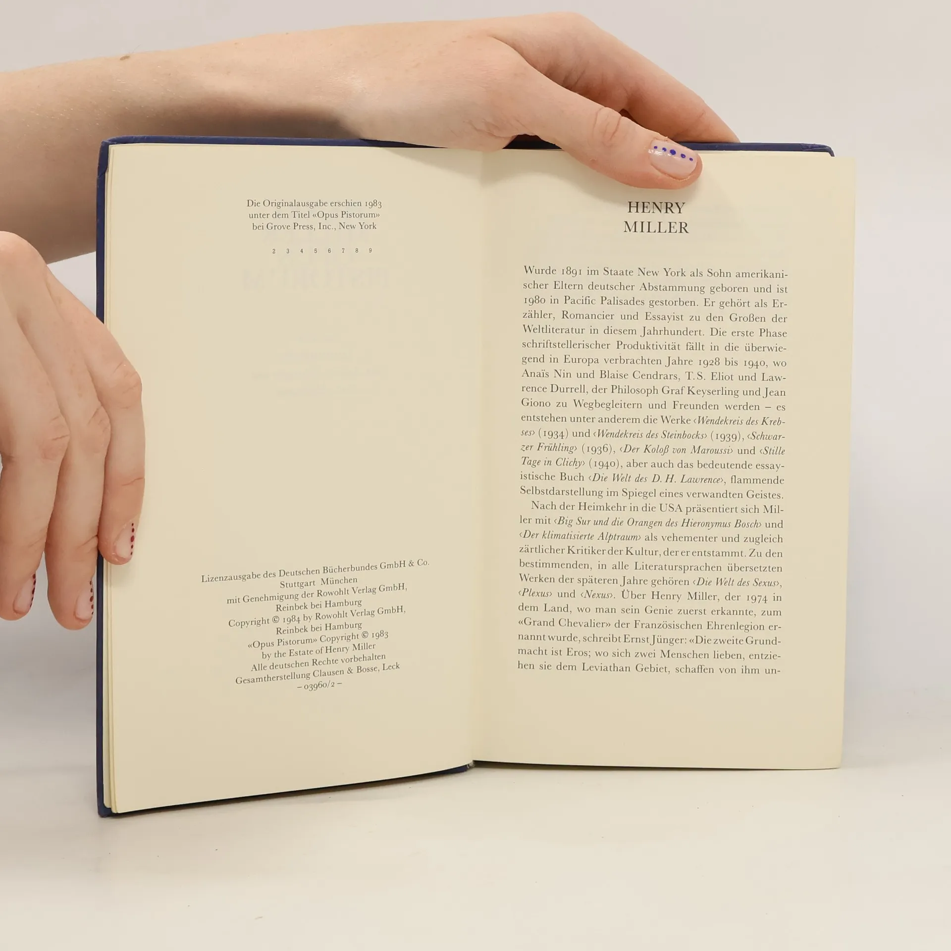 „Henry, der Geld brauchte, schlug mir vor, er werde für mich verkäufliche Texte schreiben. Ich bot ihm ein Honorar von einem Dollar pro Seite, dafür erhielt ich alle Rechte ... Ich bezahlte immer bar, wie ausgemacht. Nach wenigen Monaten ergaben die angesammelten Seiten ein komplettes Buch, dem er den Titel OPUS PISTORUM gab“ (Milton Luboviski, Buchhändler in Hollywood, 1983 in einer eidesstattlichen Erklärung).Diese spät entdeckten Erotica des großen Autors sind für Kenner - und nicht nur für diese - eine literarische Sensation.