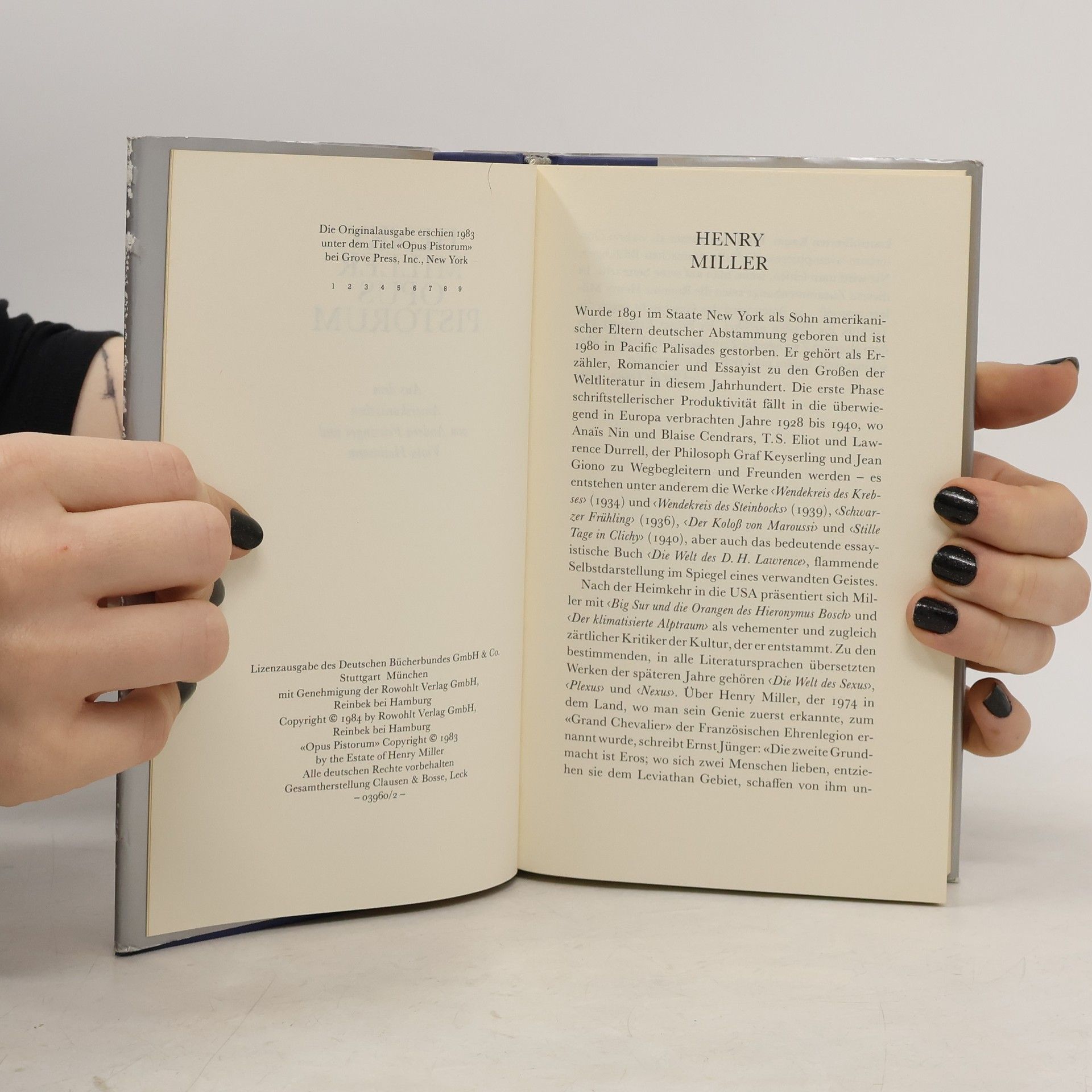 „Henry, der Geld brauchte, schlug mir vor, er werde für mich verkäufliche Texte schreiben. Ich bot ihm ein Honorar von einem Dollar pro Seite, dafür erhielt ich alle Rechte ... Ich bezahlte immer bar, wie ausgemacht. Nach wenigen Monaten ergaben die angesammelten Seiten ein komplettes Buch, dem er den Titel OPUS PISTORUM gab“ (Milton Luboviski, Buchhändler in Hollywood, 1983 in einer eidesstattlichen Erklärung).Diese spät entdeckten Erotica des großen Autors sind für Kenner - und nicht nur für diese - eine literarische Sensation.