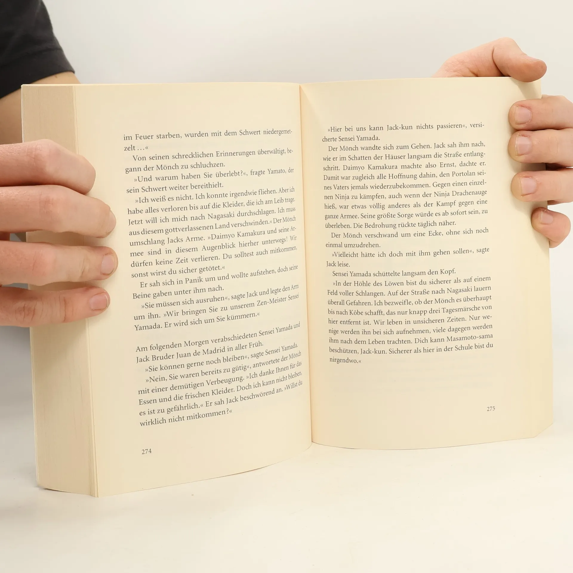 Ein Auszug aus „SAMURAI, BAND 3: DER WEG DES DRACHEN“ von Chris Bradford: Er fand mit dem Fuß Halt auf einem Vorsprung und stieg auf das geschwungene Dach hinaus. Der Boden lag tief unter ihm und sah in der Nacht aus wie ein schwarzes Meer. Jack hatte keine Angst vor Höhen, wusste aber, dass ein einziger Fehltritt ihn das Leben kosten konnte. Vor ihm kletterte der Ninja zu dem First, an dem sich die Dächer des sechsten und fünften Stockwerks trafen. Jack folgte ihm geduckt, um seinen Schwerpunkt möglichst niedrig zu halten. Am First angelangt, bemerkte der Ninja seinen Verfolger. Diesmal entschied er sich dafür zu kämpfen, statt zu fliehen. Er zog ein Blasrohr aus dem Gürtel. Jack wusste, dass ihm nur wenige Augenblicke blieben. Kurz entschlossen rannte er die letzten Meter und warf sich auf den Ninja. Beim Zusammenprall verlor der Ninja sein Blasrohr. Doch dann rutschten sie beide zur Dachtraufe hinunter. Immer schneller glitten sie in die Tiefe. Blind suchte Jack mit den Händen nach einem Halt. Im letzten Augenblick bekam er eine goldene Dachverzierung zu fassen und klammerte sich in Todesangst daran fest.