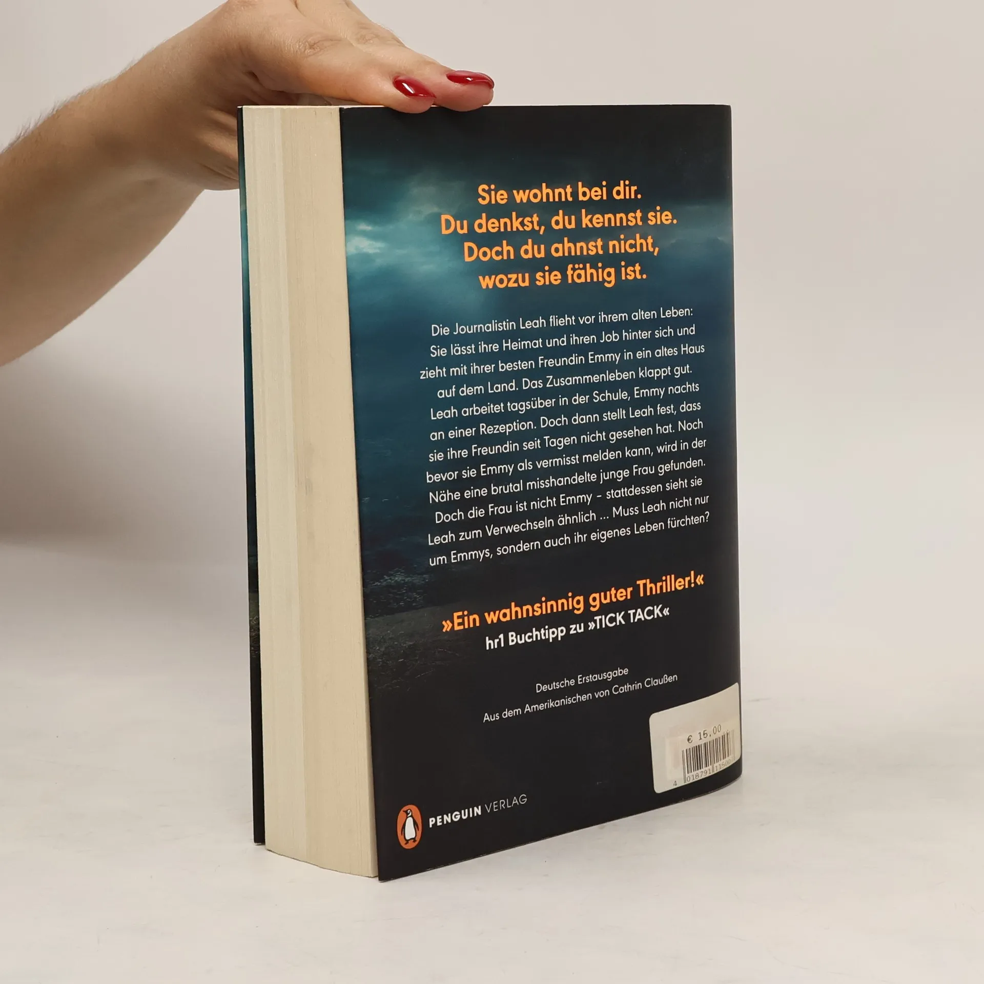 Sie wohnt bei dir. Du denkst, du kennst sie. Doch du weißt nicht, wozu sie fähig ist ... Die Journalistin Leah flieht vor ihrem alten Leben: Sie lässt ihre Heimat und ihren Job hinter sich und zieht mit ihrer besten Freundin Emmy in ein altes Haus auf dem Land. Das Zusammenleben klappt gut. Leah arbeitet tagsüber in der Schule, Emmy nachts an einer Rezeption. Doch dann stellt Leah eines Nachts fest, dass sie ihre Freundin seit Tagen nicht gesehen hat. Noch bevor sie Emmy als vermisst melden kann, wird in der Nähe eine brutal misshandelte junge Frau gefunden. Doch die Frau ist nicht Emmy – stattdessen sieht sie Leah zum Verwechseln ähnlich … Muss Leah nicht nur um Emmys, sondern auch ihr eigenes Leben fürchten?