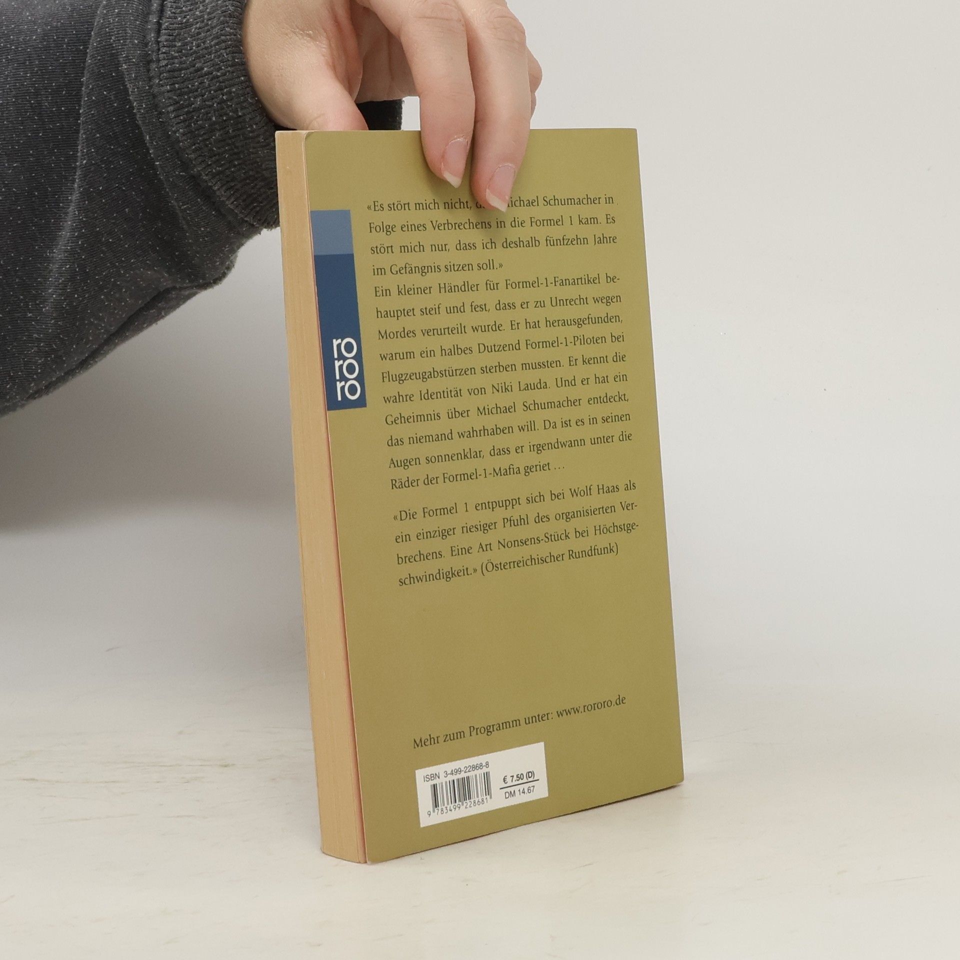 „Es stört mich nicht, dass Michael Schumacher in Folge eines Verbrechens in die Formel 1 kam. Es stört mich nur, dass ich deshalb 15 Jahre im Gefängnis sitzen soll.“Ein kleiner Händler für Formel-1-Fanartikel behauptet steif und fest, dass er zu Unrecht wegen Mordes verurteilt wurde. Er hat herausgefunden, warum ein halbes Dutzend Formel-1-Piloten bei Flugzeugabstürzen sterben mussten. Er kennt die wahre Identität von Niki Lauda. Und er hat ein Geheimnis über Michael Schumacher entdeckt, das niemand wahrhaben will. Da ist es in seinen Augen sonnenklar, dass er irgendwann unter die Räder der Formel-1-Mafia geriet…„Die Formel 1 entpuppt sich bei Wolf Haas als einziger riesiger Pfuhl des organisierten Verbrechens. eine Art Nonsens-Stück bei Höchstgeschwindigkeit.“ (Österreichischer Rundfunk)