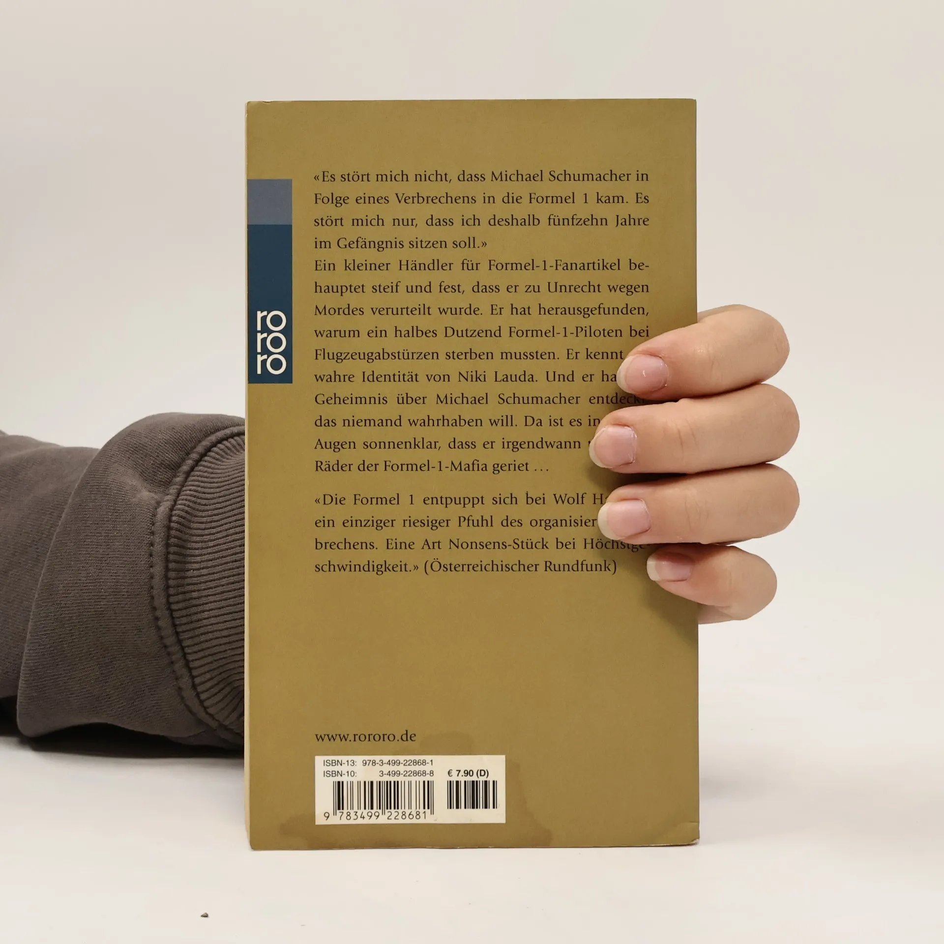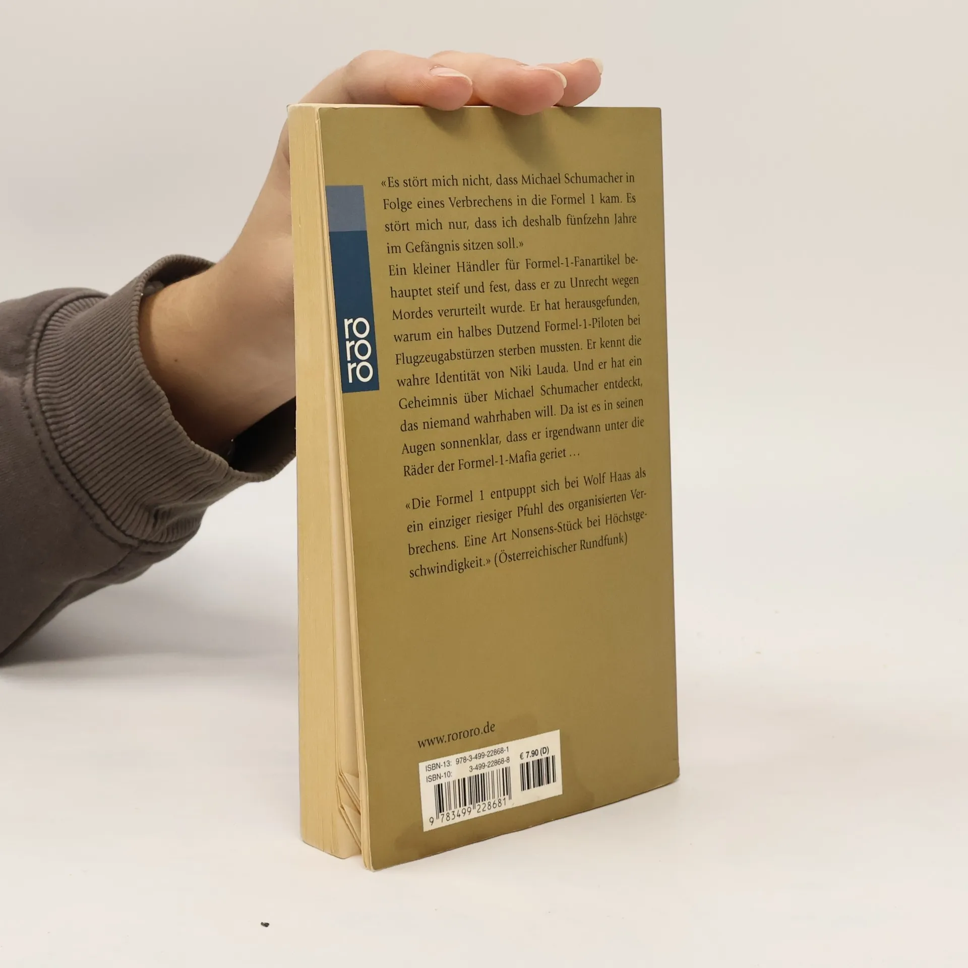 „Es stört mich nicht, dass Michael Schumacher in Folge eines Verbrechens in die Formel 1 kam. Es stört mich nur, dass ich deshalb 15 Jahre im Gefängnis sitzen soll.“Ein kleiner Händler für Formel-1-Fanartikel behauptet steif und fest, dass er zu Unrecht wegen Mordes verurteilt wurde. Er hat herausgefunden, warum ein halbes Dutzend Formel-1-Piloten bei Flugzeugabstürzen sterben mussten. Er kennt die wahre Identität von Niki Lauda. Und er hat ein Geheimnis über Michael Schumacher entdeckt, das niemand wahrhaben will. Da ist es in seinen Augen sonnenklar, dass er irgendwann unter die Räder der Formel-1-Mafia geriet…„Die Formel 1 entpuppt sich bei Wolf Haas als einziger riesiger Pfuhl des organisierten Verbrechens. eine Art Nonsens-Stück bei Höchstgeschwindigkeit.“ (Österreichischer Rundfunk)
