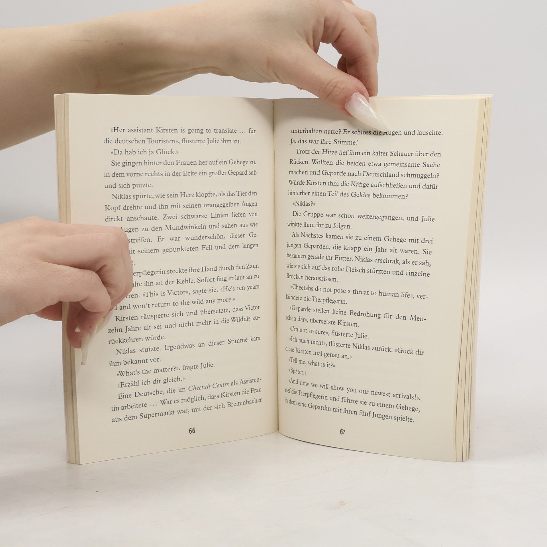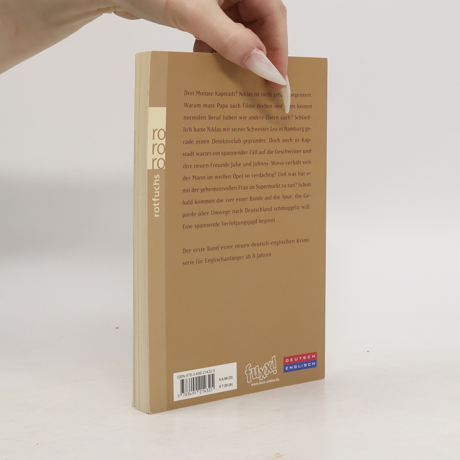 Drei Monate Kapstadt? Niklas ist nicht gerade begeistert. Warum muss Papa auch Filme drehen und kann keinen normalen Beruf haben wie andere Eltern auch? Schließlich hatte Niklas mit seiner Schwester Lea in Hamburg gerade einen Detektivclub gegründet. Doch auch in Kapstadt wartet ein spannender Fall auf die Geschwister und ihre neuen Freunde Julie und Johnny: Wieso verhält sich der Mann im weißen Opel so verdächtig? Und was hat er mit der geheimnisvollen Frau im Supermarkt zu tun? Schon bald kommen die vier einer Bande auf die Spur, die Geparde über Umwege nach Deutschland schmuggeln will. Eine spannende Verfolgungsjagd beginnt . . .Der erste Band einer neuen deutsch-englischen Krimiserie für Englischanfänger ab 10 Jahren.