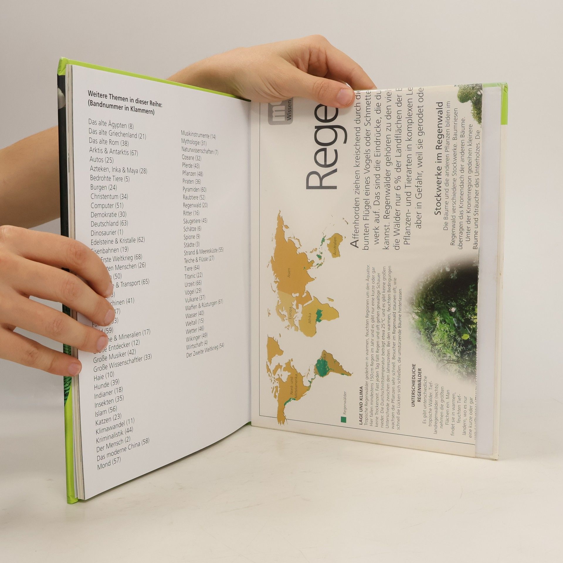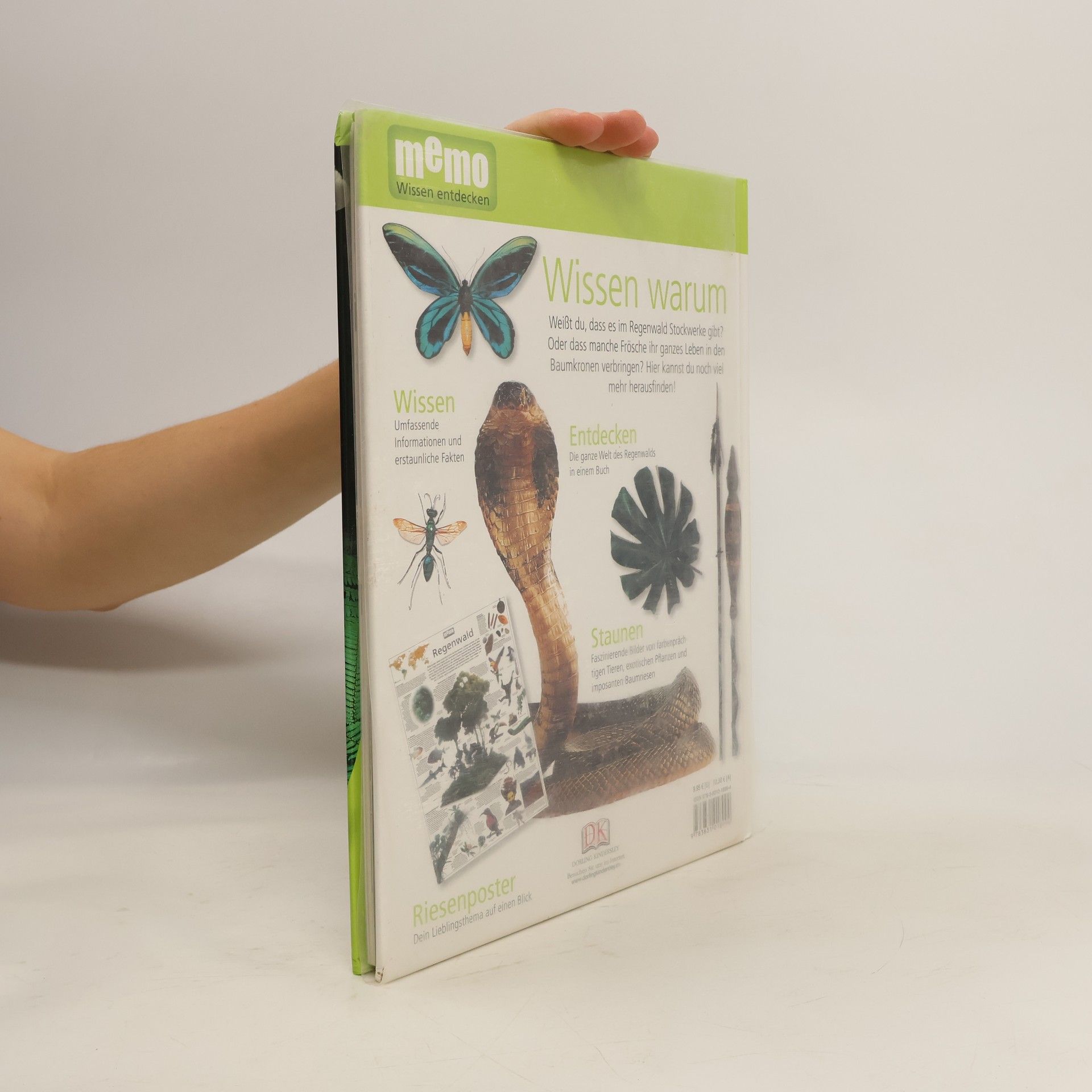 Affenhorden ziehen kreischend durch die Baumkronen, Insekten summen und die bunten Flügel eines Vogels oder Schmetterlings blitzen zwischen dem dichten Blattwerk auf. Regenwälder gehören zu den vielfältigsten Ökosystemen der Erde. Obwohl die Wälder nur 6 % der Landflächen der Erde bedecken, leben hier etwa 50 % aller Pflanzen- und Tierarten in komplexen Lebensgemeinschaften. Was ist der Regenwald? Welche Tiere und Pflanzen gibt es dort? Wie kann man den Regenwald schützen? Auf diese und viele weitere Fragen bekommen Kinder in Band 20 der neuen großen Wissensreihe memo Antworten. Faszinierende Bilder von farbenprächtigen Tieren, exotischen Pflanzen und imposanten Baumriesen lassen den Regenwald im Kinderzimmer erwachen. Kurze, gut gegliederte Texte erklären die Thematik für Kinder leicht verständlich. Auch schwierigere Sachverhalte werden so begreifbar. Rubriken wie „Erstaunliche Fakten“, „Fragen und Antworten“ und „Rekordverdächtig“ vertiefen das vermittelte Wissen. Ein Glossar am Ende des Buches gibt noch einmal einen Überblick über das ganze Thema. Ideal auch für Referate und Schulprojekte.