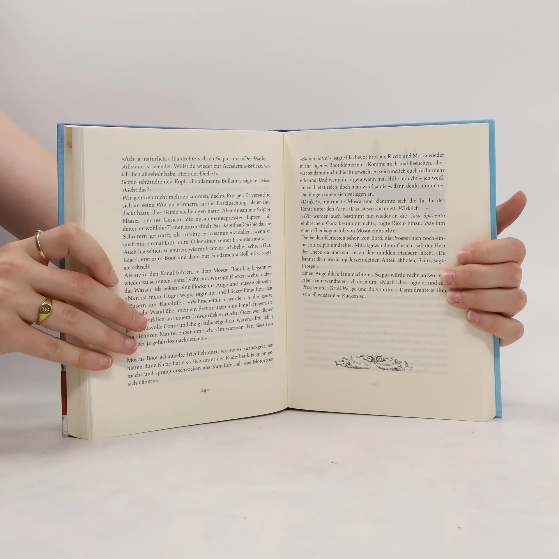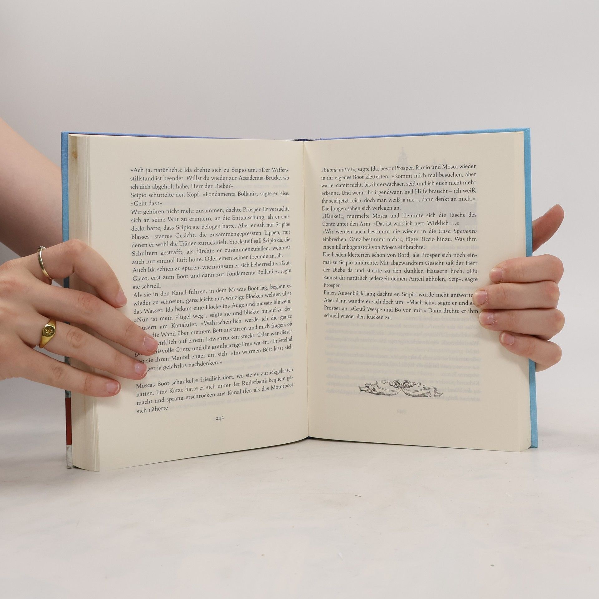 Der geheimnisvolle Anführer einer Kinderbande in Venedig, der Herr der Diebe, hält seine Gruppe mit dem Verkauf von Beute über Wasser. Prosper und Bo, zwei Ausreißer auf der Flucht vor ihrer Tante und dem Detektiv Victor, finden Unterschlupf bei der Bande. Als Victor den Kindern auf die Spur kommt, bringt er alle in Gefahr. Die Gemeinschaft der Bande droht zu zerbrechen, als ein rätselhafter Auftrag des mysteriösen „Conte“ die Kinder auf eine scheinbar unbewohnte Laguneninsel führt, die ein Geheimnis birgt, das alles verändert. Cornelia Funke, die bereits mit ihrem Bestseller „Drachenreiter“ ihr Erzähltalent unter Beweis stellte, fesselt Leser jeden Alters von der ersten Zeile an. Sie entführt uns in ein winterliches Venedig, verstrickt uns in verwirrende Rätsel und erfüllt ihren Helden am Ende einen alten Menschheitstraum. Die Autorin, ausgezeichnet mit der Kalbacher Klapperschlange 2001, schafft eine dichte, atmosphärische Welt, die zeitlose Themen wie Abenteuer, Freundschaft und die Suche nach einem Zuhause behandelt. Mit vielschichtigen Charakteren und einer spannenden Handlung verwebt Funke verschiedene Erzählstränge zu einem atemberaubenden Abenteuerroman für Kinder ab 10 Jahren, ergänzt durch von ihr selbst gezeichnete Kapitelvignetten, die die Leser in ein magisches Venedig ziehen.
