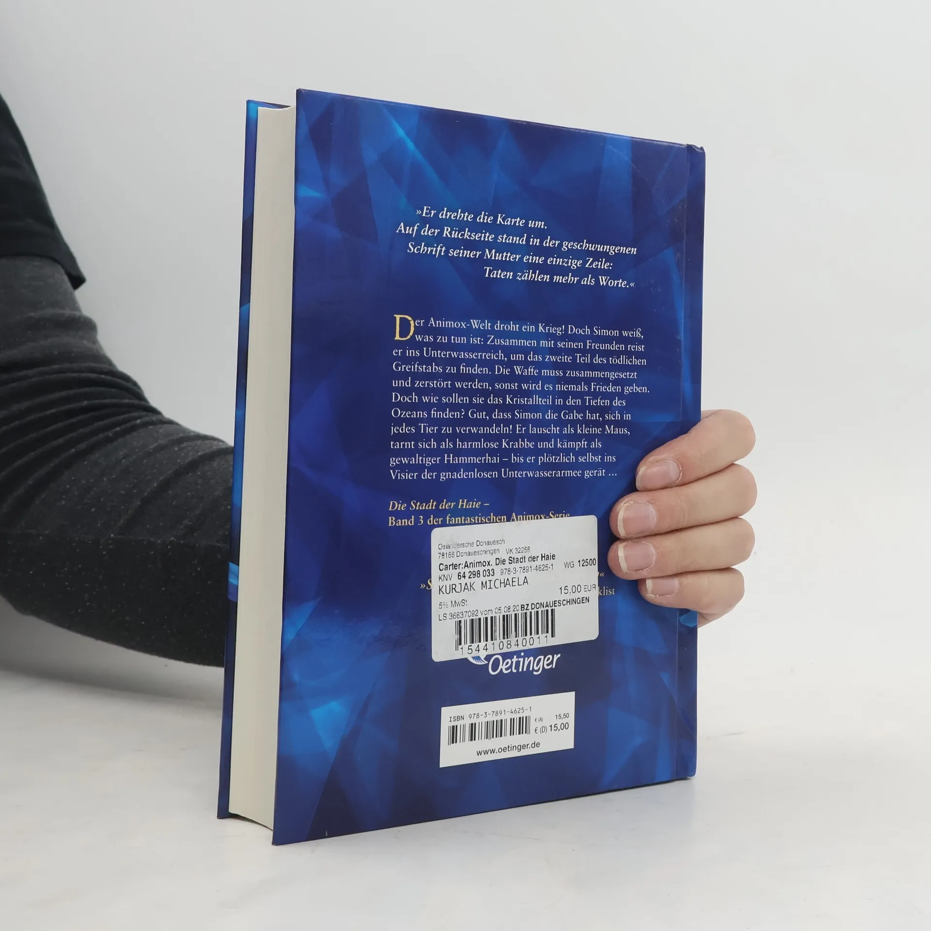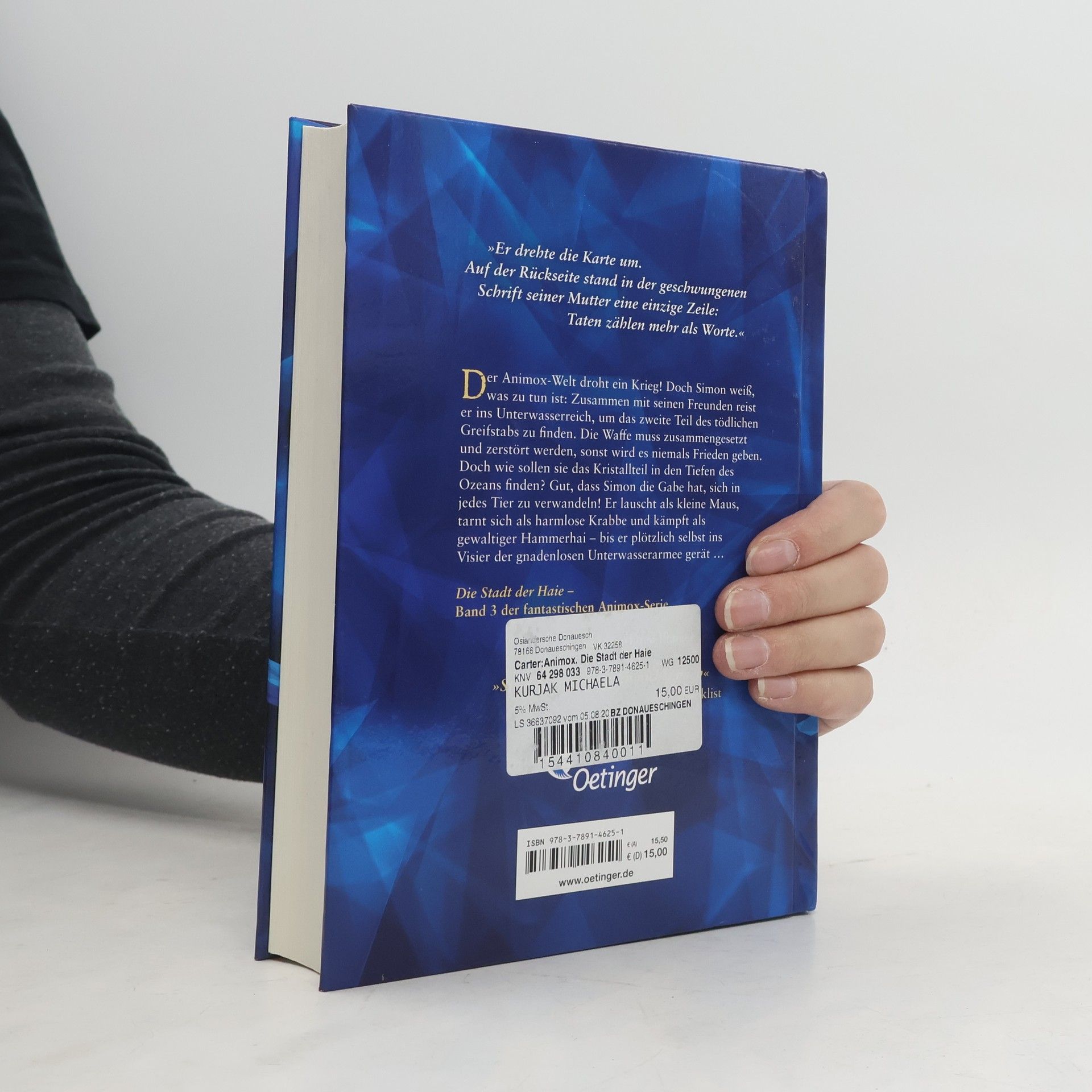 Die Saga der Tierwandler: Der Kampf der Tierreiche tobt und Simon steckt mittendrin. Kaum ist er den tödlichen Gefahren des Schlangenreichs entkommen, erwartet ihn und seine Freunde schon das nächste Abenteuer. Die Suche nach den verschollenen Stücken jener Waffe, die einst dem sagenumwobenen Anführer aller Tierreiche gehörte, führt die Tierwandler in die Stadt der Haie. In den dunklen Tiefen des Pazifiks bekommt Simon es mit finsteren Gestalten zu tun. Und mit der Frage, ob er das Richtige wagt oder die Seinen gefährdet. Atemberaubender dritter Band der erfolgreichen Tierfantasy.