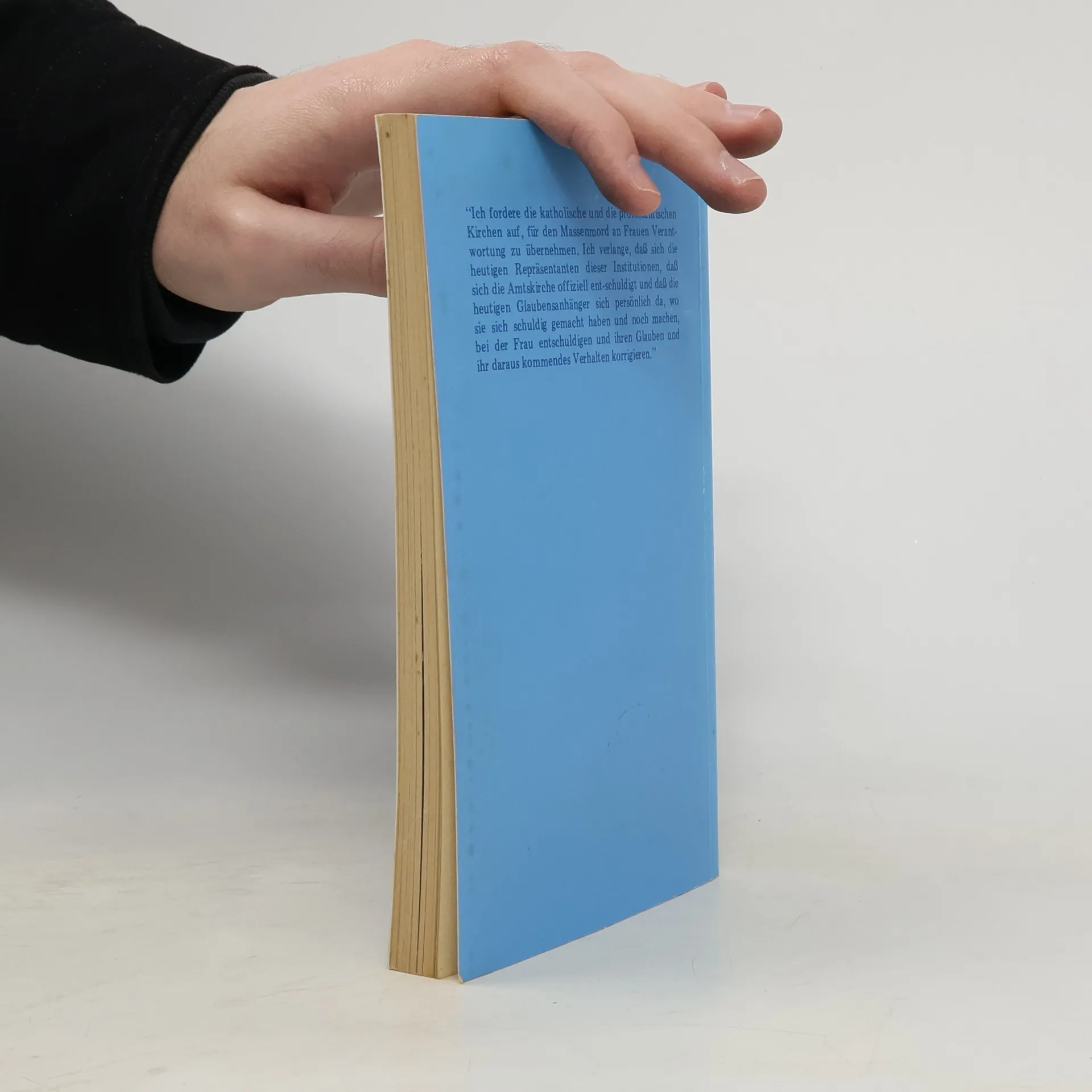 'Ich fordere die katholische und die protestantische Kirche auf, für den Massenmord an Frauen Verantwortung zu übernehmen. Ich verlange, daß sich die heutigen Repräsentanten dieser Institutionen, daß sich die Amtskirche offiziell entschuldigt und daß die heutigen Glaubensanhänger sich persönlich da, wo sie sich schuldig gemacht haben und noch machen, bei der Frau enschuldigen und ihren Glauben und ihr daraus kommendes Verhalten korrigieren.'