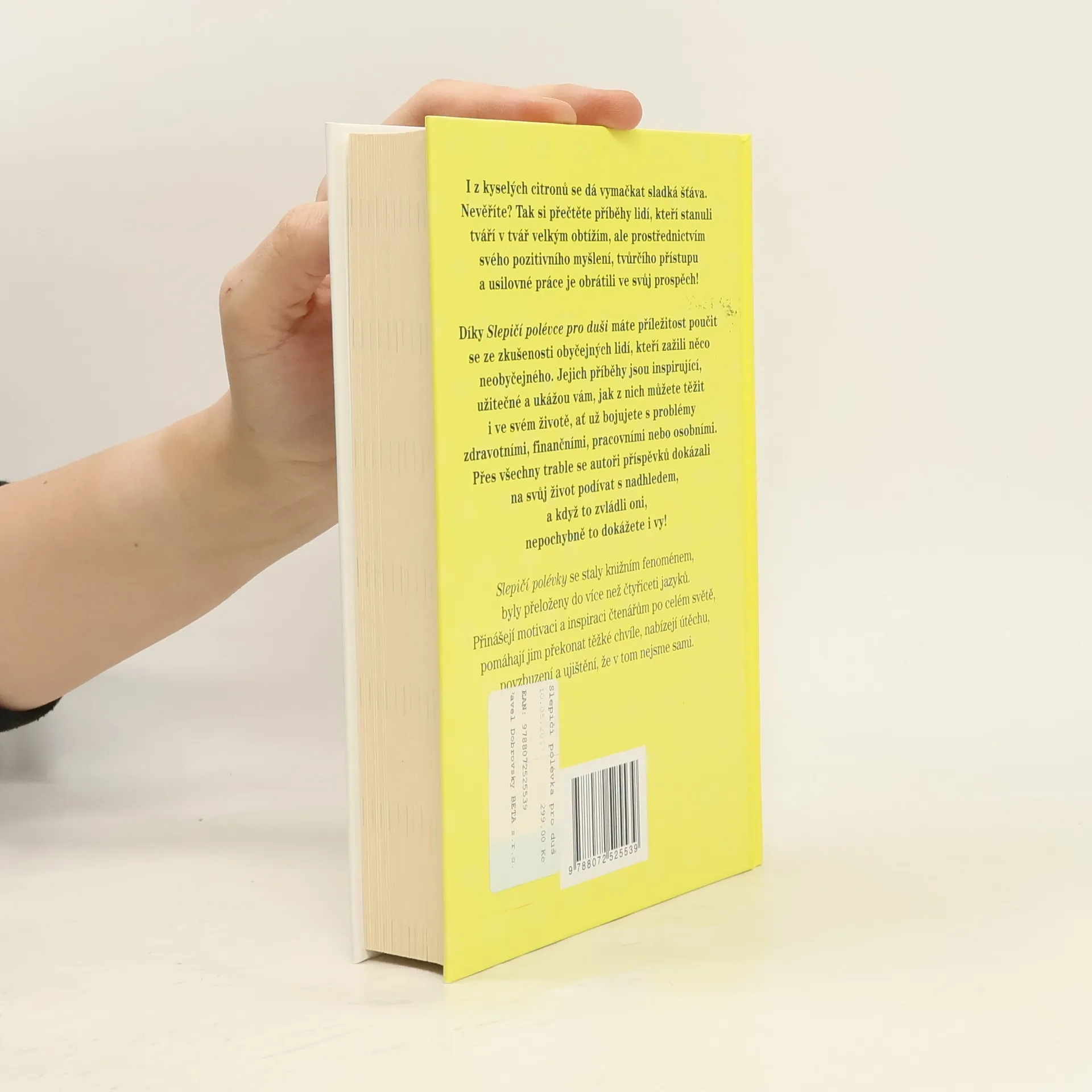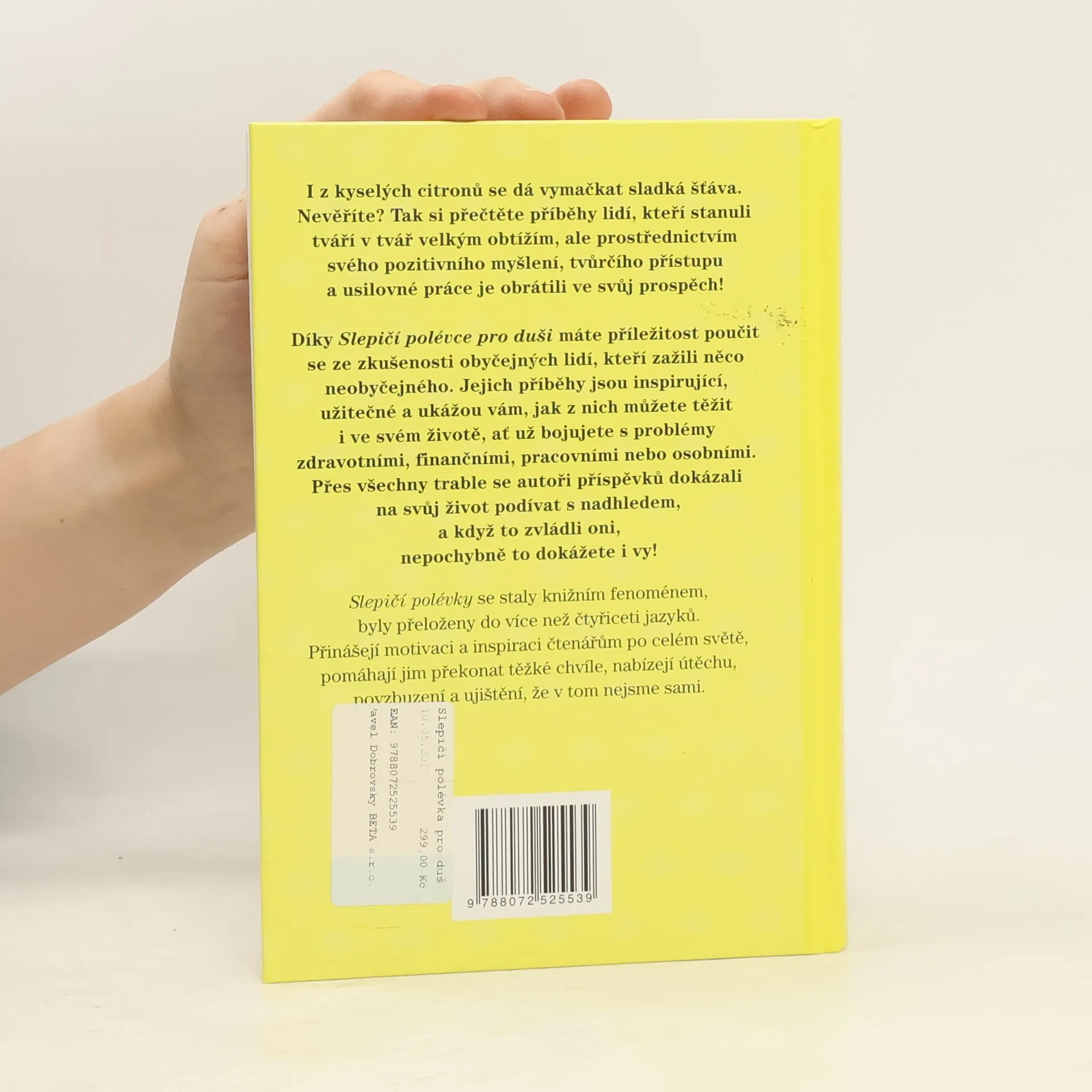 I z kyselých citronů se dá vymačkat sladká šťáva. Nevěříte? Tak si přečtěte příběhy lidí, kteří stanuli tváří v tvář velkým obtížím, ale prostřednictvím svého pozitivního myšlení, tvůrčího přístupu a usilovné práce je obrátili ve svůj prospěch! Díky Slepičí polévce pro duši máte příležitost poučit se ze zkušenosti obyčejných lidí, kteří zažili něco neobyčejného. Jejich příběhy jsou inspirující, užitečné a ukážou vám, jak z nich můžete těžit i ve svém životě, ať už bojujete s problémy zdravotními, finančními, pracovními nebo osobními. Přes všechny trable se autoři příspěvků dokázali na svůj život podívat s nadhledem, a když to zvládli oni, nepochybně to dokážete i vy! Slepičí polévky se staly knižním fenoménem, byly přeloženy do více než čtyřiceti jazyků. Přinášejí motivaci a inspiraci čtenářům po celém světě, pomáhají jim překonat těžké chvíle, nabízejí útěchu, povzbuzení a ujištění, že v tom nejsme sami.