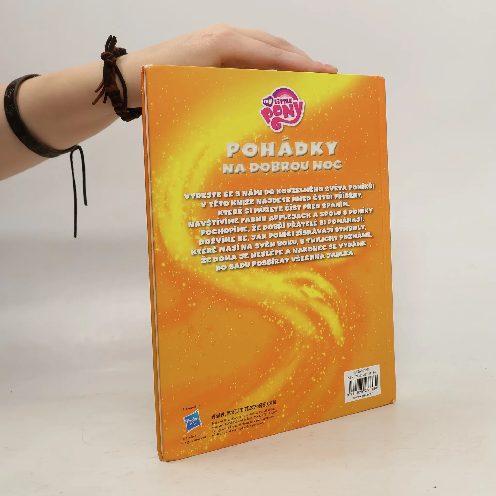 Vydejte se s námi do kouzelného světa poníků! V této knize najdete hned čtyři příběhy, které si můžete číst před spaním. Navštívíme farmu Applejack a spolu s poníky pochopíme, že dobří přátelé si pomáhají. Dozvíme se, jak poníci získávají symboly, které mají na svém boku. S Twilight poznáme, že doma je nejlépe a nakonec se s poníky vydáme do sadu posbírat všechna jablka.