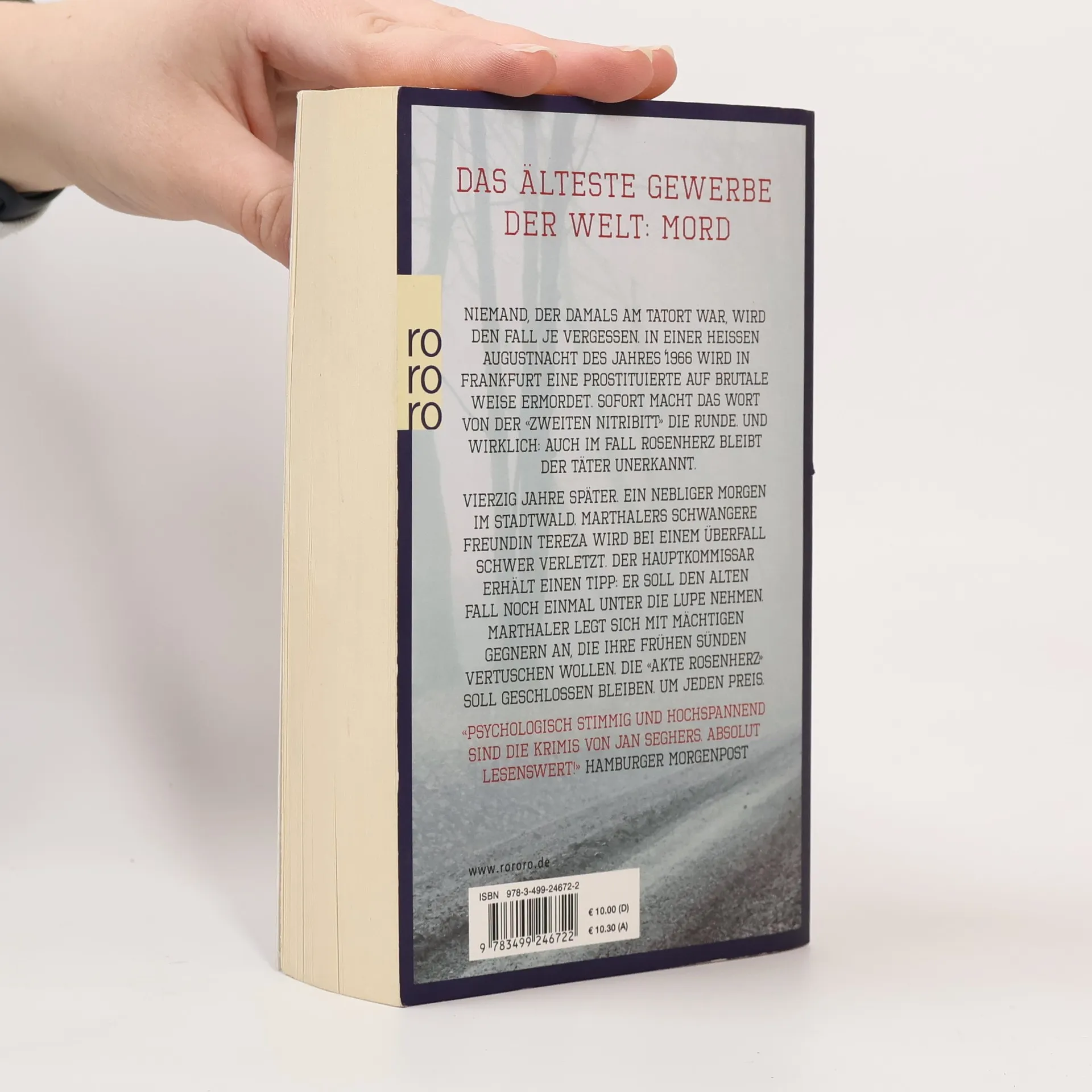 Das älteste Gewerbe der Welt: Mord.Niemand, der damals am Tatort war, wird den Fall je vergessen. In einer heißen Augustnacht des Jahres 1966 wird in Frankfurt eine Prostituierte auf brutale Weise ermordet. Sofort macht das Wort von der «zweiten Nitribitt» die Runde. Und wirklich: Auch im Fall Rosenherz bleibt der Täter unerkannt.Vierzig Jahre später. Ein nebliger Morgen im Stadtwald. Marthalers schwangere Freundin Tereza wird bei einem Überfall schwer verletzt. Der Hauptkommissar erhält einen Tipp: Er soll den alten Fall noch einmal unter die Lupe nehmen. Marthaler legt sich mit mächtigen Gegnern an, die ihre frühen Sünden vertuschen wollen. Die «Akte Rosenherz» soll geschlossen bleiben. Um jeden Preis. «Psychologisch stimmig und hochspannend sind die Krimis von Jan Seghers. Absolut lesenswert!» Hamburger Morgenpost