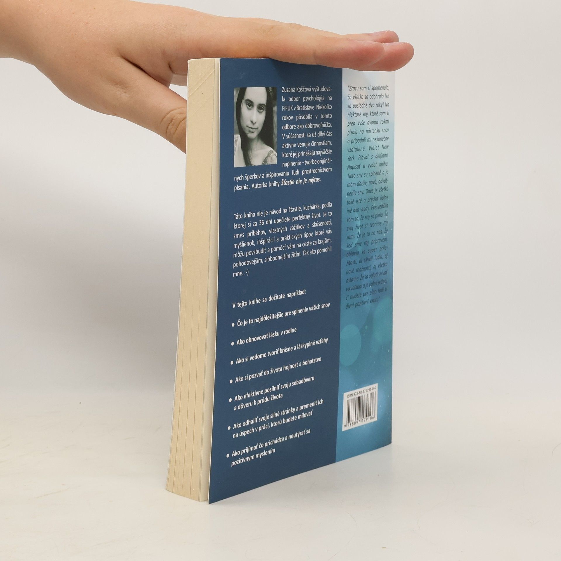 Táto kniha nie je návod na šťastie, kuchárka, podľa ktorej si za 36 dní upečiete perfektný život. Je to zmes príbehov, vlastných zážitkov a skúseností, myšlienok, inšpirácií a praktických tipov, ktoré vás môžu povzbudiť a pomôcť vám na ceste za krajším, pohodovejším, slobodnejším žitím. Tak ako pomohli mne. :-) V tejto knihe sa dočítate napríklad: čo je to najdôležitejšie pre splnenie vašich snov ako obnovovať lásku v rodine ako si vedome tvoriť krásne a láskyplné vzťahy ako posilniť svoju sebadôveru a dôveru k prúdu života ako si pozvať do života hojnosť a bohatstvo ako odhaliť svoje silné stránky a premeniť ich na úspech v práci, ktorú budete milovať ako prijímať čo prichádza a neutýrať sa pozitívnym myslením