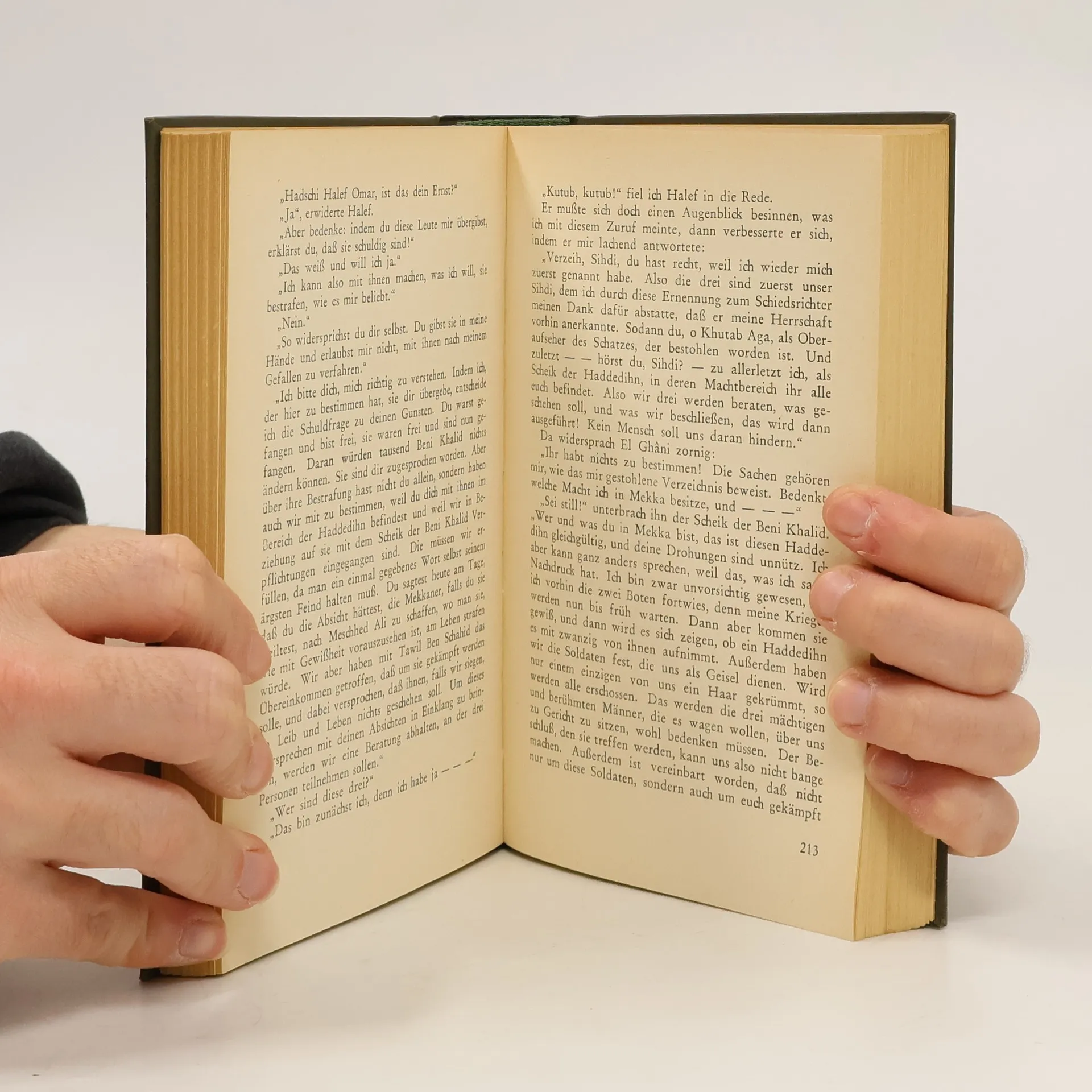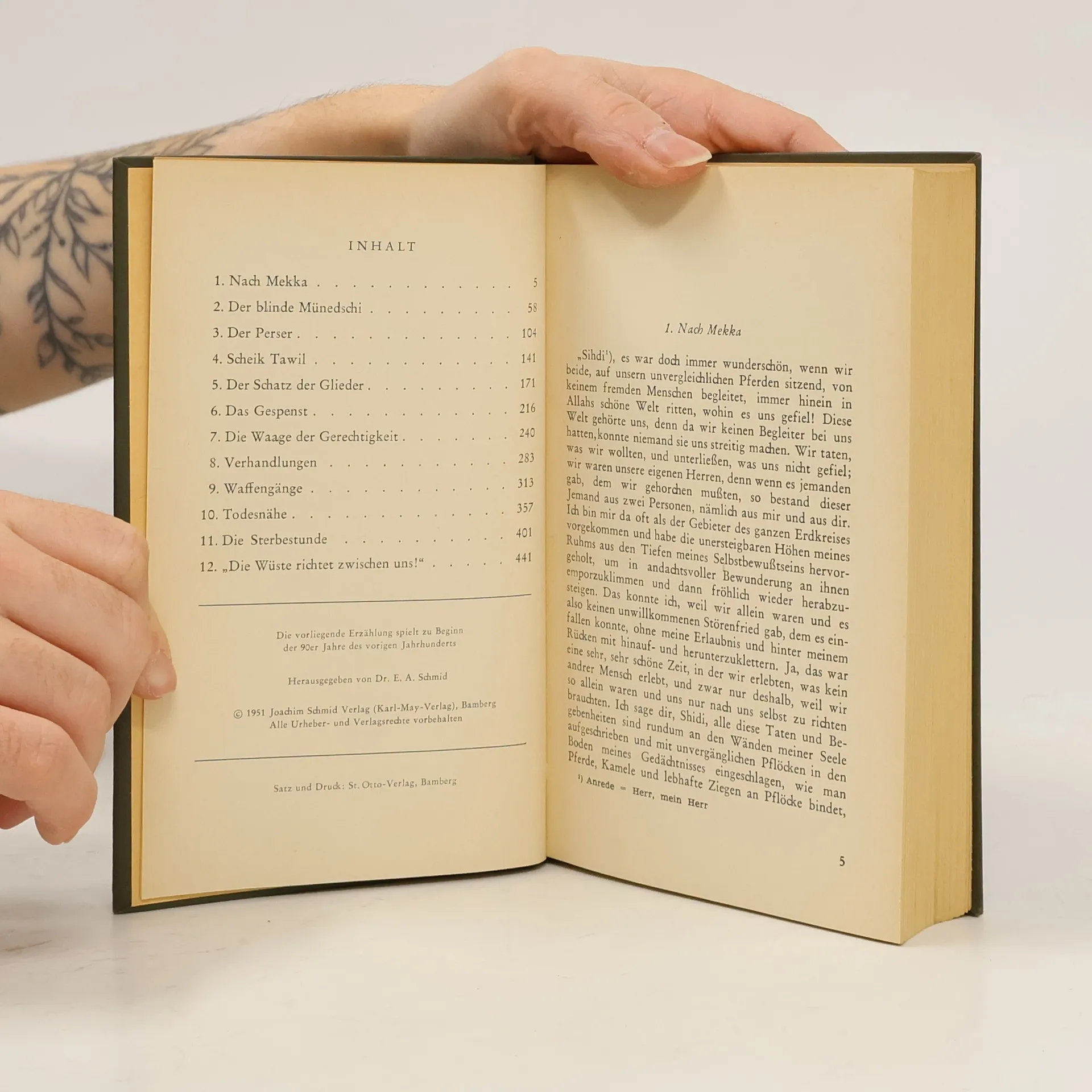 Auf einer Reise durch die arabische Wüste stoßen Kara Ben Nemsi und Hadschi Halef Omar auf einen geheimnisvollen blinden Seher, den ‚Münedschi‘, der von seinem verräterischen Begleiter ‚El Ghani‘ dort hilflos zurückgelassen wurde. Gemeinsam macht man sich auf den Weg Richtung Mekka. Wenig später stellt sich heraus, dass der üble ‚El Ghani‘ zudem den Schatz der heiligen Stätten von Meschhed Ali gestohlen hat. Die Freunde erklären sich bereit, dem Schatzwächter Khutab Aga bei der Jagd nach dem Räuber beizustehen. Ein gefährliches Unterfangen, denn dieser schreckt auch vor Mord nicht zurück. Das Buch markiert den Übergang von der romantischen Abenteuererzählung zu Mays Spätwerk. Besonders eindrucksvoll sind die Visionen vom Jüngsten Gericht gestaltet.
