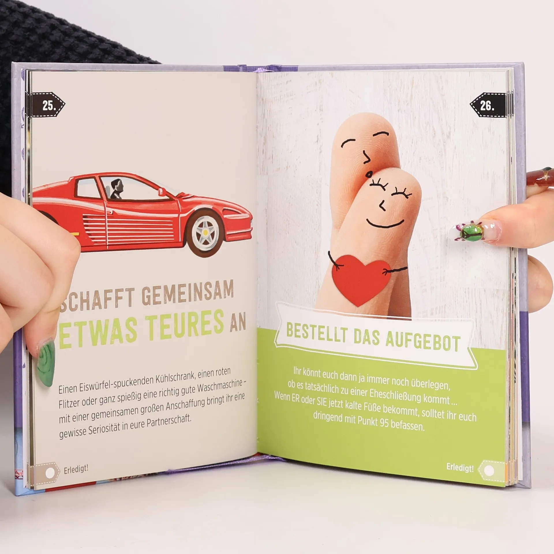 Dieses Buch bringt Spaß in den Beziehungsalltag. Es bietet zahlreiche Anregungen für gemeinsame Aktivitäten, wie lustige Fotos im Automaten, Besuche an besonderen Orten oder entspannende Tage in der Therme. Solche Erlebnisse stärken die Bindung zwischen Partnern und sorgen für Abwechslung im Alltag. Mit einem Augenzwinkern werden 100 Dinge aufgelistet, die jedes Paar einmal ausprobieren sollte. Auf jeder Seite gibt es eine Ankreuzmöglichkeit, sodass die Leser aktiv verfolgen können, welche Aktivitäten sie bereits erlebt haben. Es ist das ideale Geschenk für Paare, egal ob sie frisch verliebt oder schon lange zusammen sind. Das modern gestaltete Buch umfasst 96 Seiten mit unterhaltsamen Texten und passenden Farbfotografien. Es enthält ein praktisches Lesebändchen und eignet sich hervorragend als Mitbringsel zu Anlässen wie Hochzeiten, Jahrestagen oder einfach als nette Geste zwischendurch. Eine originelle Geschenkidee für Paare, die vielleicht zu viel Zeit auf dem Sofa verbringen oder nach neuen Unternehmungen suchen. Mit diesem Buch bringen Sie Spaß und Abwechslung in das Leben befreundeter Paare oder in Ihr eigenes.