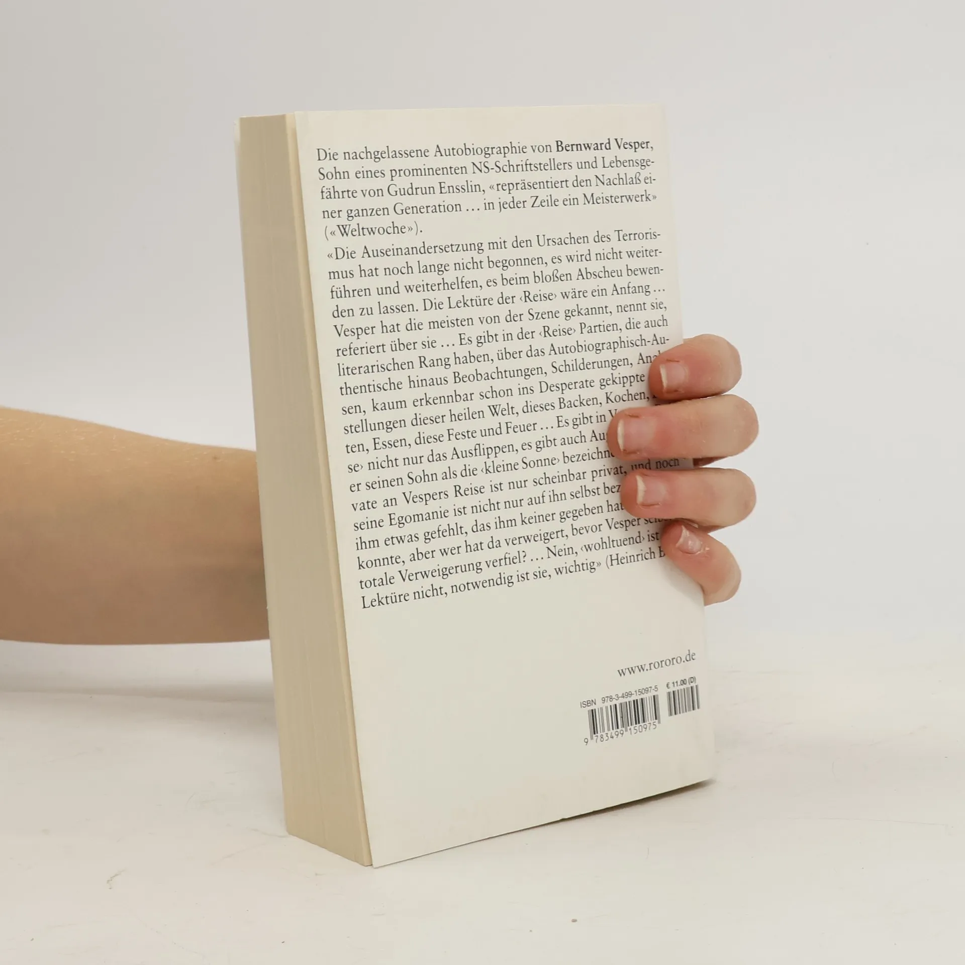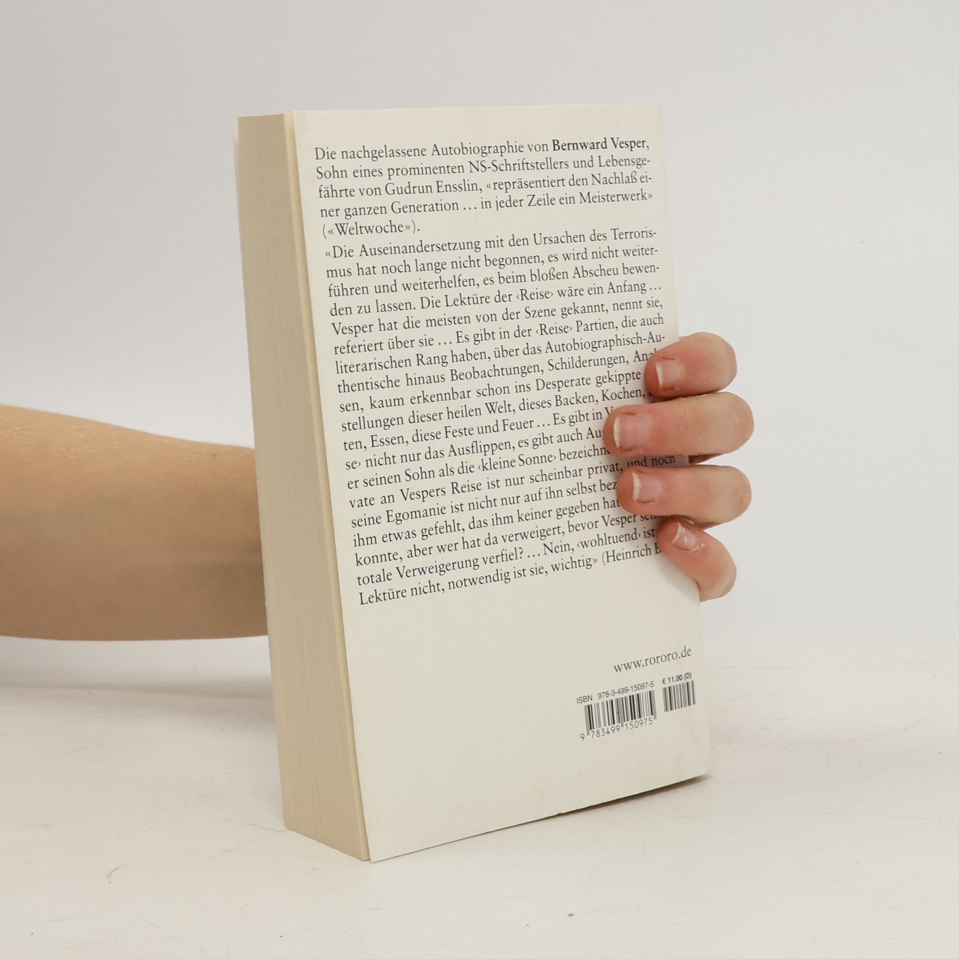 „Die Auseinandersetzung mit den Ursachen des Terrorismus hat noch lange nicht begonnen, es wird nicht weiterführen und weiterhelfen, es beim bloßen Abscheu bewenden zu lassen. Die Lektüre der “Reise„ wäre ein Anfang... Vesper hat die meisten von der Szene gekannt, nennt sie, referiert über sie... Es gibt in der “Reise„ Partien, die auch literarischen Rang haben, über das Autobiograph-Authentische hinaus Beobachtungen, Analysen, Schilderungen, kaum erkennbar schon ins Desperate gekippte Darstellungen dieser heilen Welt, dieses Backen, Kochen, Ernten, Essen, diese Feste und Feuer ... Es gibt in Vespers “Reise" nicht nur das Ausgeflippte, es gibt auch Augenblicke, wo er seinen Sohn als die 'kleine Sonne' bezeichnet ... Das Private an Vespers Reise ist nur scheinbar privat, und noch seine Egomanie ist nicht nur auf ihn selbst bezogen, es hat ihm etwas gefehlt, dass ihm keiner gegeben hat oder geben konnte, aber wer hat da verweigert, bevor Vesper selber in die totale Verweigerung verfiel? Nein, 'wohltuend' ist diese Lektüre nicht, notwendig ist sie, wichtig" (Heinrich Böll).