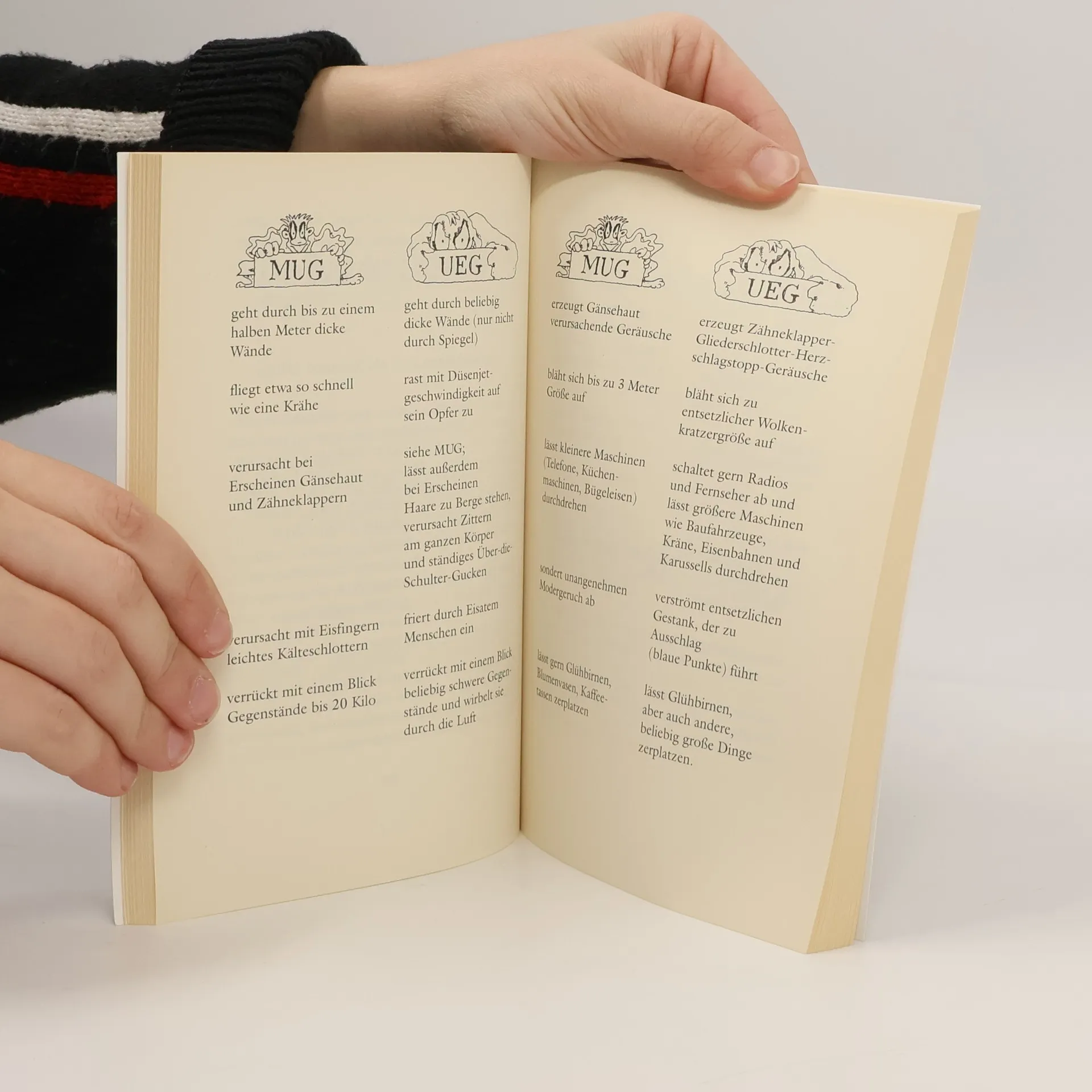 Ein schleimiges Gespenst sitzt im Keller. Tom rennt mit schlotternden Knien zur Treppe. Bloß weg hier, denkt er. Wie gut, dass ihm die Freundin seiner Großmutter, Hedwig Kümmelsaft, helfen will. Frau Kümmelsaft ist eine anerkannte Gespensterjägerin. Sie kennt all die Hausmittel, die ein Mittelmäßig Unheimliches Gespenst, ein MUG, vertreiben. Als ihm Tom damit zu Leibe rücken will, merkt er, dass das Kellergespenst mit Namen Hugo ziemlich in der Patsche sitzt.