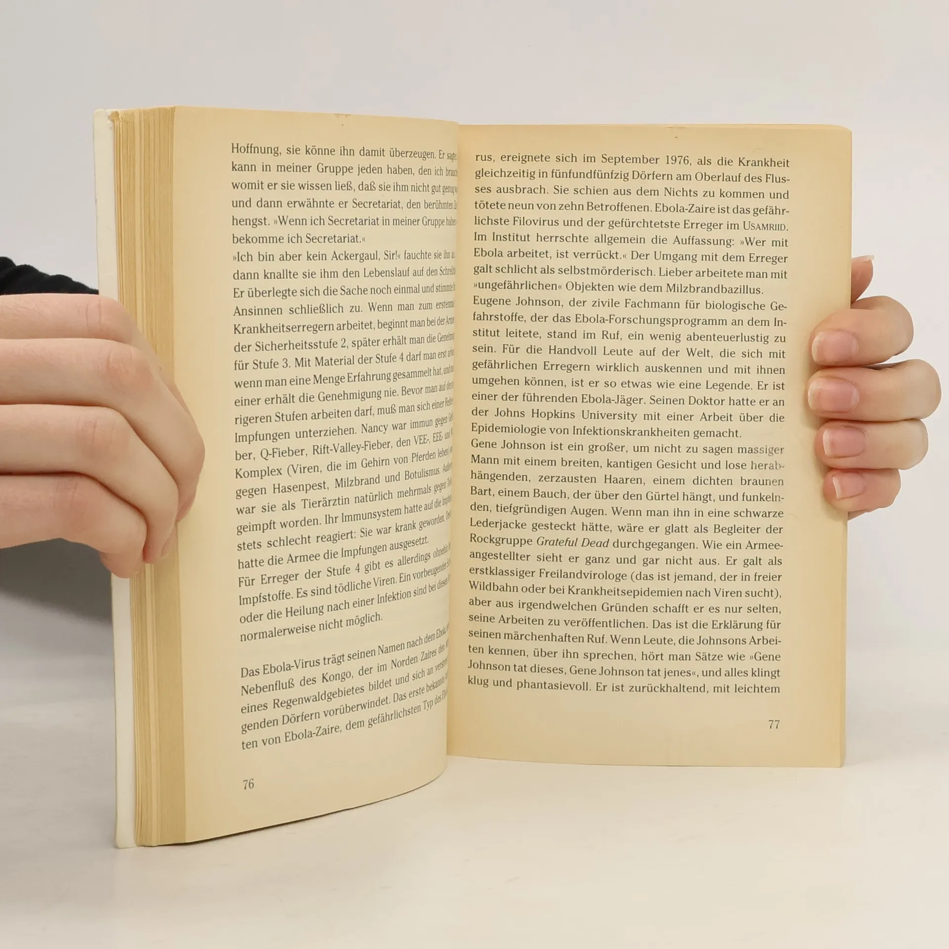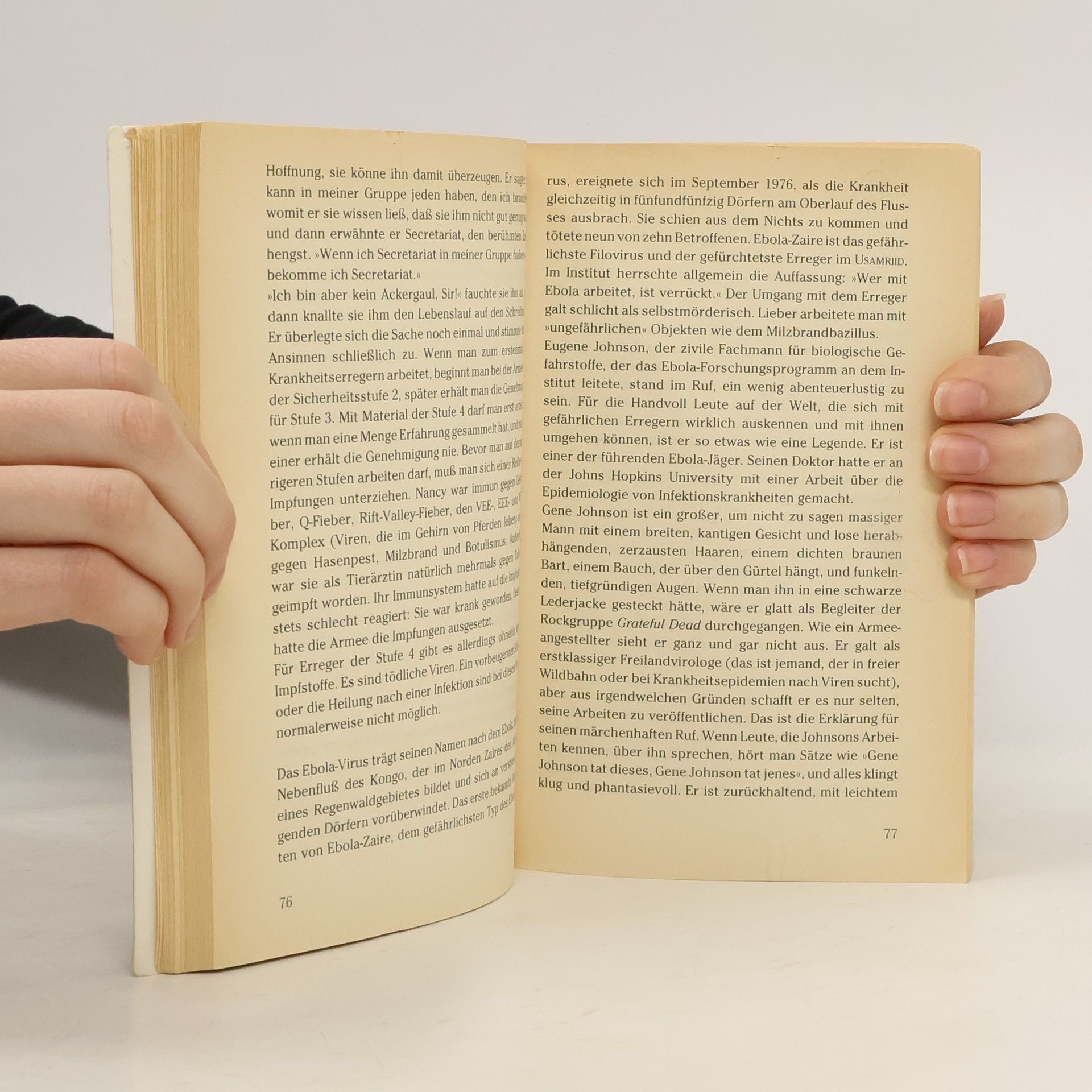Richard Prestons populärwissenschaftlicher Tatsachen-Thriller liest sich spannender als jeder Horror-Roman. Preston berichtet darin über die ersten Infektionen mit dem Ebola-Virus vor über vierzig Jahren. Sein Tatsachenthriller von 1998 ist immer noch hochaktuell, wie die schreckliche Ebola-Epidemie in Zentralafrika gerade zeigt. Ebola gehört zu den gefährlichsten Killerviren. Diese aus dem Afrikanischen Regenwald stammenden sogenannten „Filoviren“, können einen Menschen auf grausamste Art und Weise töten. Das Virus löst innerhalb weniger Tage die inneren Organe auf, und der Erkrankte verblutet von innen. Das Virus ist zudem extrem ansteckend, und weltweit gibt es immer noch kein wirksames Heilmittel dagegen. Deshalb ist es nicht auszuschließen, dass die Menschheit eines Tages einer Seuche wie Ebola erliegen könnte. Preston schildert, wie der Ebola-Erreger über Affen, die für medizinische Versuche importiert wurden, schließlich nach Amerika kommt. In einem kleinen Labor in Reston, USA, verbreitet er Angst und Schrecken. Als sich die Seuche unter den im Quarantänelager zusammengepferchten Affen ausbreitet, rufen die Betreiber der Anlage die Gesundheitsbehörden zu Hilfe. Bald müssen die Wissenschaftler feststellen, dass sich das Virus inzwischen nicht nur durch Kontakt, sondern auch durch die Luft verbreiten kann.