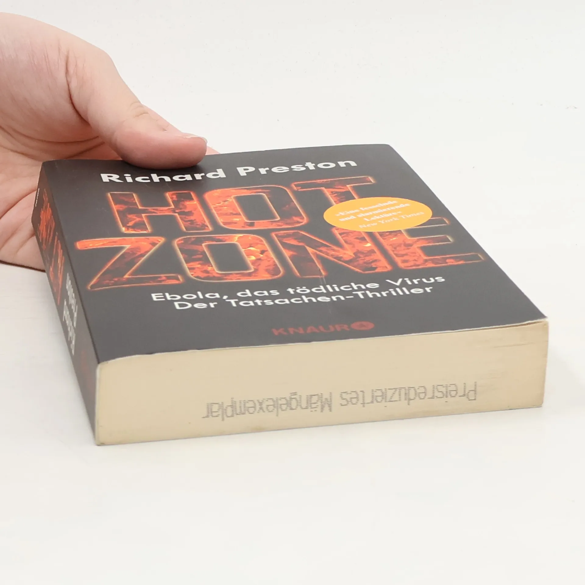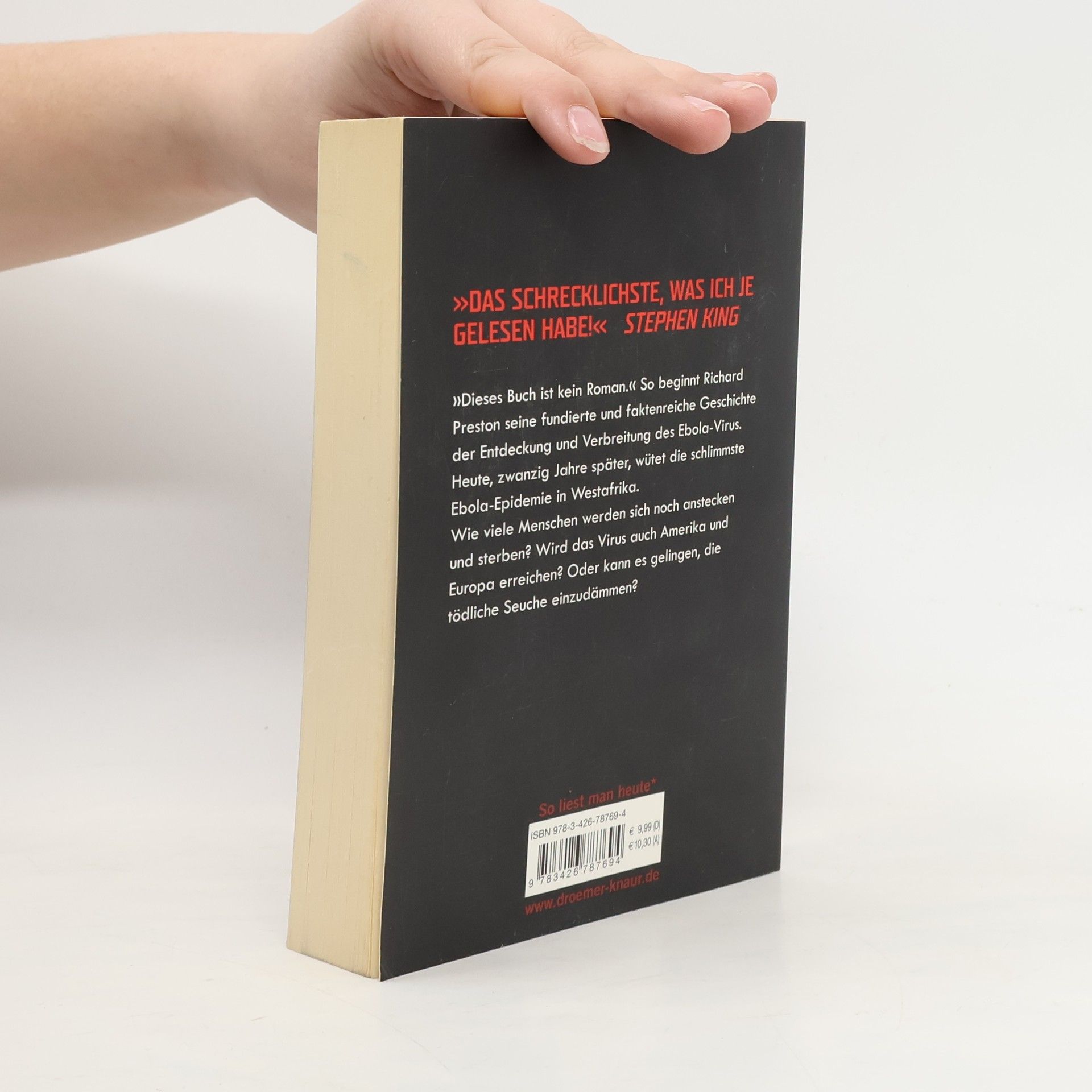 Richard Prestons populärwissenschaftlicher Tatsachen-Thriller liest sich spannender als jeder Horror-Roman. Preston berichtet darin über die ersten Infektionen mit dem Ebola-Virus vor über vierzig Jahren. Sein Tatsachenthriller von 1998 ist immer noch hochaktuell, wie die schreckliche Ebola-Epidemie in Zentralafrika gerade zeigt. Ebola gehört zu den gefährlichsten Killerviren. Diese aus dem Afrikanischen Regenwald stammenden sogenannten „Filoviren“, können einen Menschen auf grausamste Art und Weise töten. Das Virus löst innerhalb weniger Tage die inneren Organe auf, und der Erkrankte verblutet von innen. Das Virus ist zudem extrem ansteckend, und weltweit gibt es immer noch kein wirksames Heilmittel dagegen. Deshalb ist es nicht auszuschließen, dass die Menschheit eines Tages einer Seuche wie Ebola erliegen könnte. Preston schildert, wie der Ebola-Erreger über Affen, die für medizinische Versuche importiert wurden, schließlich nach Amerika kommt. In einem kleinen Labor in Reston, USA, verbreitet er Angst und Schrecken. Als sich die Seuche unter den im Quarantänelager zusammengepferchten Affen ausbreitet, rufen die Betreiber der Anlage die Gesundheitsbehörden zu Hilfe. Bald müssen die Wissenschaftler feststellen, dass sich das Virus inzwischen nicht nur durch Kontakt, sondern auch durch die Luft verbreiten kann.