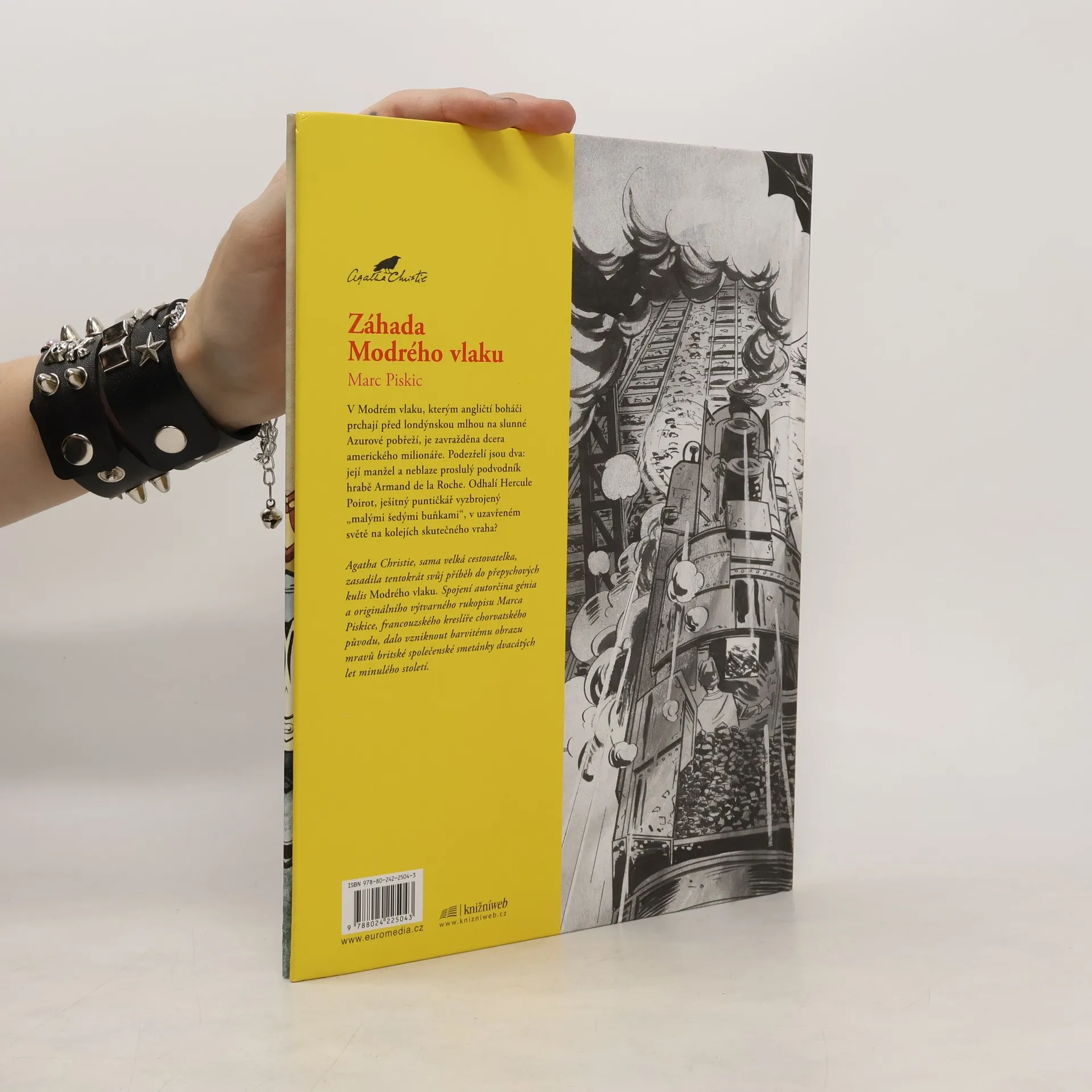 V Modrém vlaku, kterým angličtí boháči prchají před londýnskou mlhou na slunné Azurové pobřeží, je zavražděna dcera amerického milionáře. Podezřelí jsou dva: její manžel a neblaze proslulý podvodník hrabě Armand de la Roche. Odhalí Hercula Poirot, ješitný puntičkář vyzbrojený „malými šedými buňkami“, v uzavřeném světě na kolejích skutečného vraha? Agatha Christie, sama velká cestovatelka, zasadila tentokrát svůj příběh do přepychových kulis Modrého vlaku. Spojení autorčina génia a originálního výtvarného rukopisu Marca Piskice, francouzského kreslíře chorvatského původu, dalo vzniknout barvitému obrazu mravů britské společenské smetánky dvacátých let minulého století.