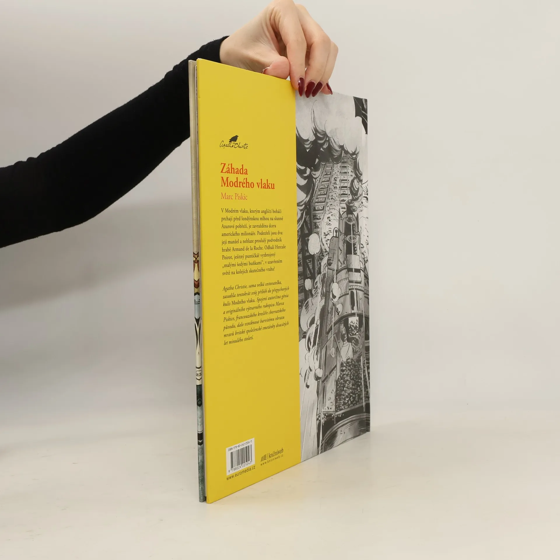 V Modrém vlaku, kterým angličtí boháči prchají před londýnskou mlhou na slunné Azurové pobřeží, je zavražděna dcera amerického milionáře. Podezřelí jsou dva: její manžel a neblaze proslulý podvodník hrabě Armand de la Roche. Odhalí Hercula Poirot, ješitný puntičkář vyzbrojený „malými šedými buňkami“, v uzavřeném světě na kolejích skutečného vraha? Agatha Christie, sama velká cestovatelka, zasadila tentokrát svůj příběh do přepychových kulis Modrého vlaku. Spojení autorčina génia a originálního výtvarného rukopisu Marca Piskice, francouzského kreslíře chorvatského původu, dalo vzniknout barvitému obrazu mravů britské společenské smetánky dvacátých let minulého století.