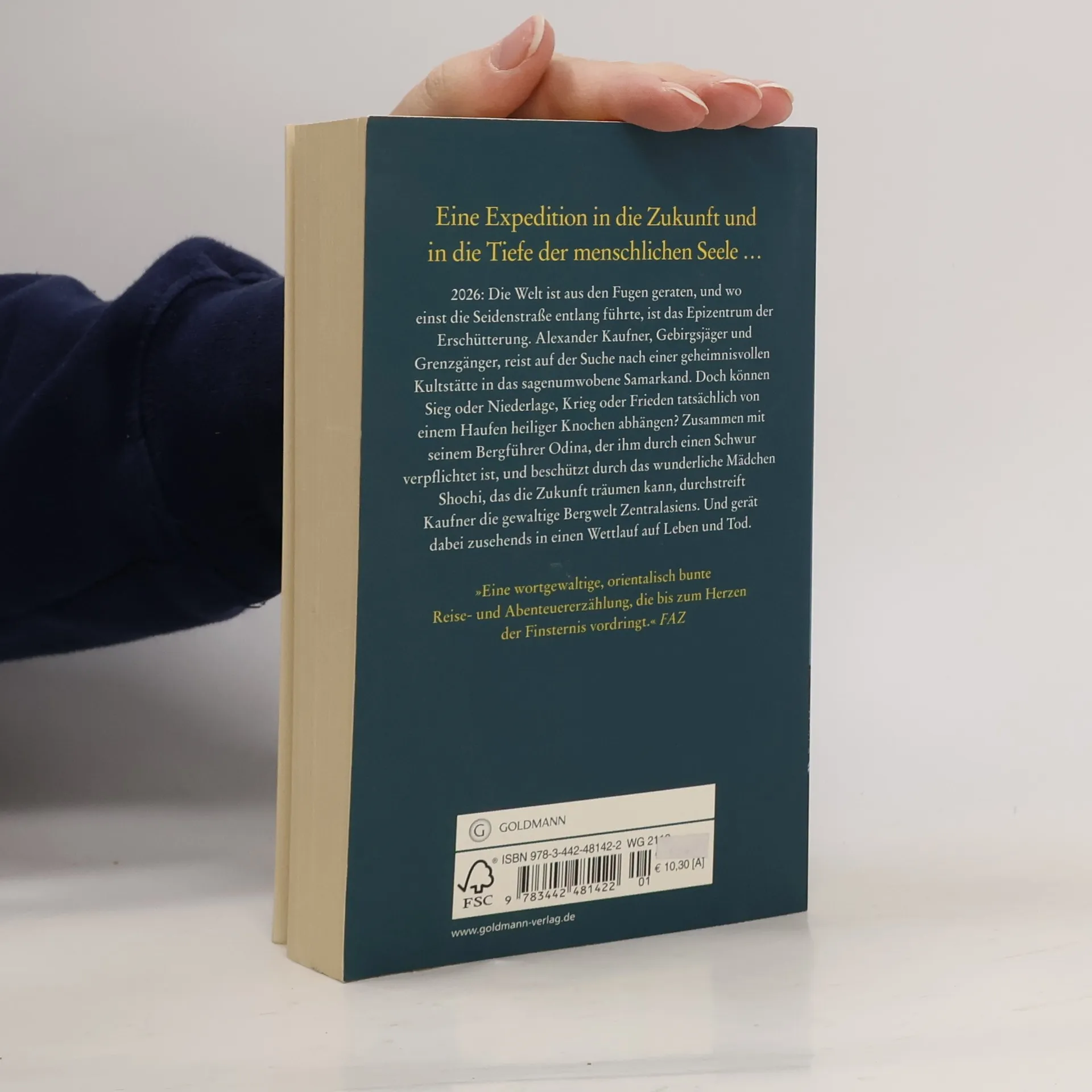2026: Die Welt ist aus den Fugen geraten, doch eine Kultstätte in Samarkand könnte den Schlüssel zur Rettung bergen. 2026: Die Welt ist aus den Fugen geraten, und wo einst die Seidenstraße entlang führte, ist das Epizentrum der Erschütterung. Alexander Kaufner, Gebirgsjäger und Grenz gänger, reist auf der Suche nach einer geheimnisvollen Kultstätte in das sagenumwobene Samarkand. Doch können Sieg oder Niederlage, Krieg oder Frieden tatsächlich von einem Haufen heiliger Knochen abhängen? Zusammen mit seinem Bergführer Odina, der ihm durch einen Schwur verpfl ichtet ist, und beschützt durch das wunderliche Mädchen Shochi, das die Zukunft träumen kann, durchstreift Kaufner die gewaltige Bergwelt Zentralasiens. Und gerät dabei zusehends in einen Wettlauf auf Leben und Tod.