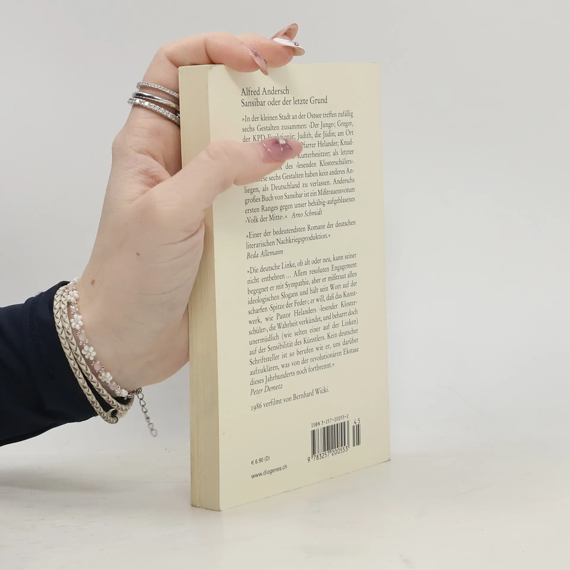 In einer kleinen Stadt an der Ostsee treffen zufällig sechs Gestalten zusammen: ›Der Junge‹; Gregor, der KPD-Funktionär; Judith, die Jüdin; am Ort selbst befinden sich der Pfarrer Helander; Knudsen, der Fischer und Kutterbesitzer; als letzter die Holzplastik des ›Lesenden Klosterschülers‹. Und diese sechs Gestalten haben kein anderes Anliegen, als Deutschland zu verlassen... Alfred Anderschs großes Buch von Sansibar ist ein Mißtrauensvotum ersten Ranges gegen unser behäbig aufgeblasenes ›Volk der Mitte‹.