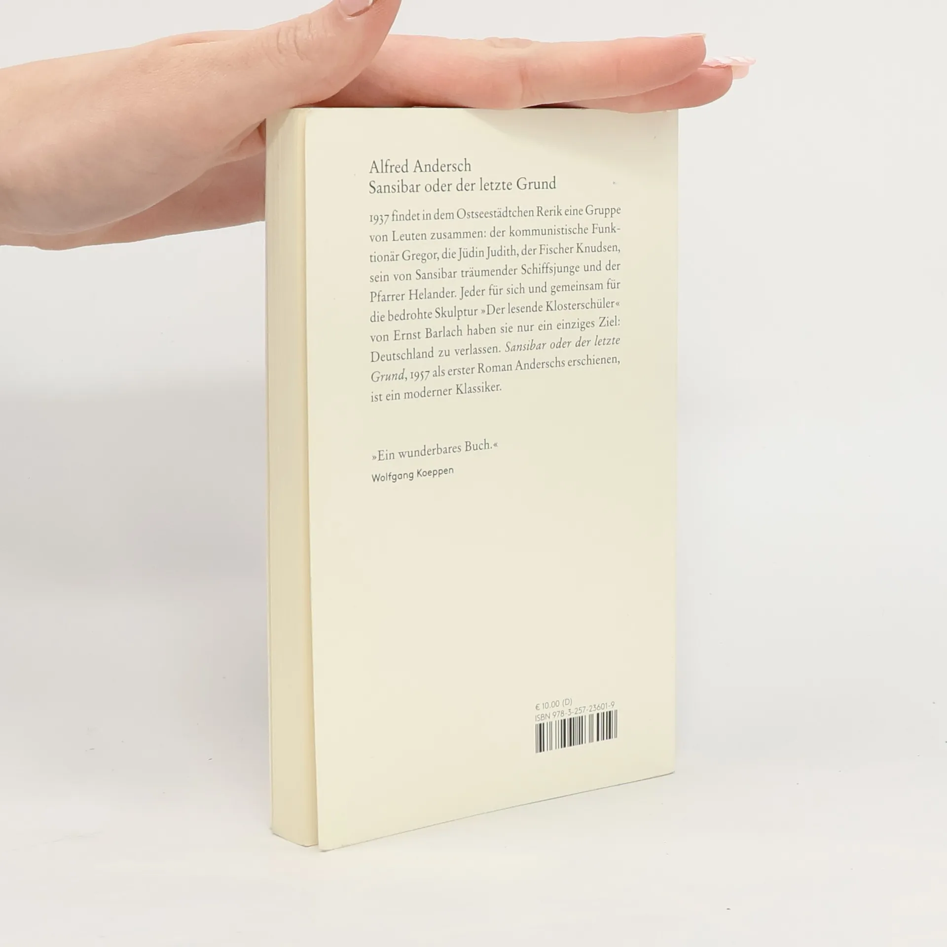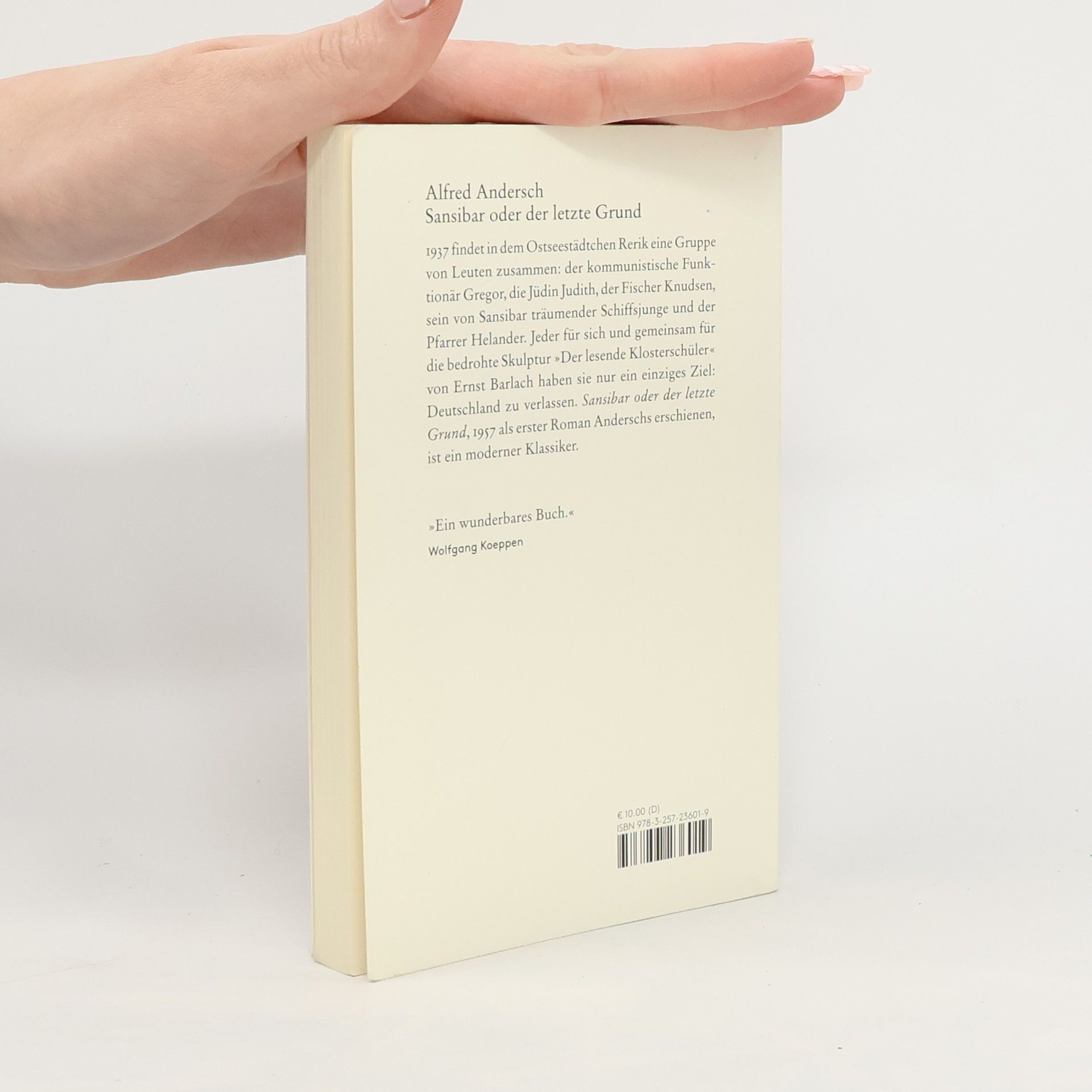 »In einer kleinen Stadt an der Ostsee treffen zufällig sechs Gestalten zusammen: Der Junge; Gregor, der KPD-Funktionär; Judith, die Jüdin; am Ort selbst befinden sich der Pfarrer Helander; Knudsen, der Fischer und Kutterbesitzer; als letzter die Holzplastik des Lesenden Klosterschülers. Und diese sechs Gestalten haben kein anderes Anliegen, als Deutschland zu verlassen... Alfred Anderschs großes Buch von Sansibar ist ein Mißtrauensvotum ersten Ranges gegen unser behäbig aufgeblasenes Volk der Mitte.«