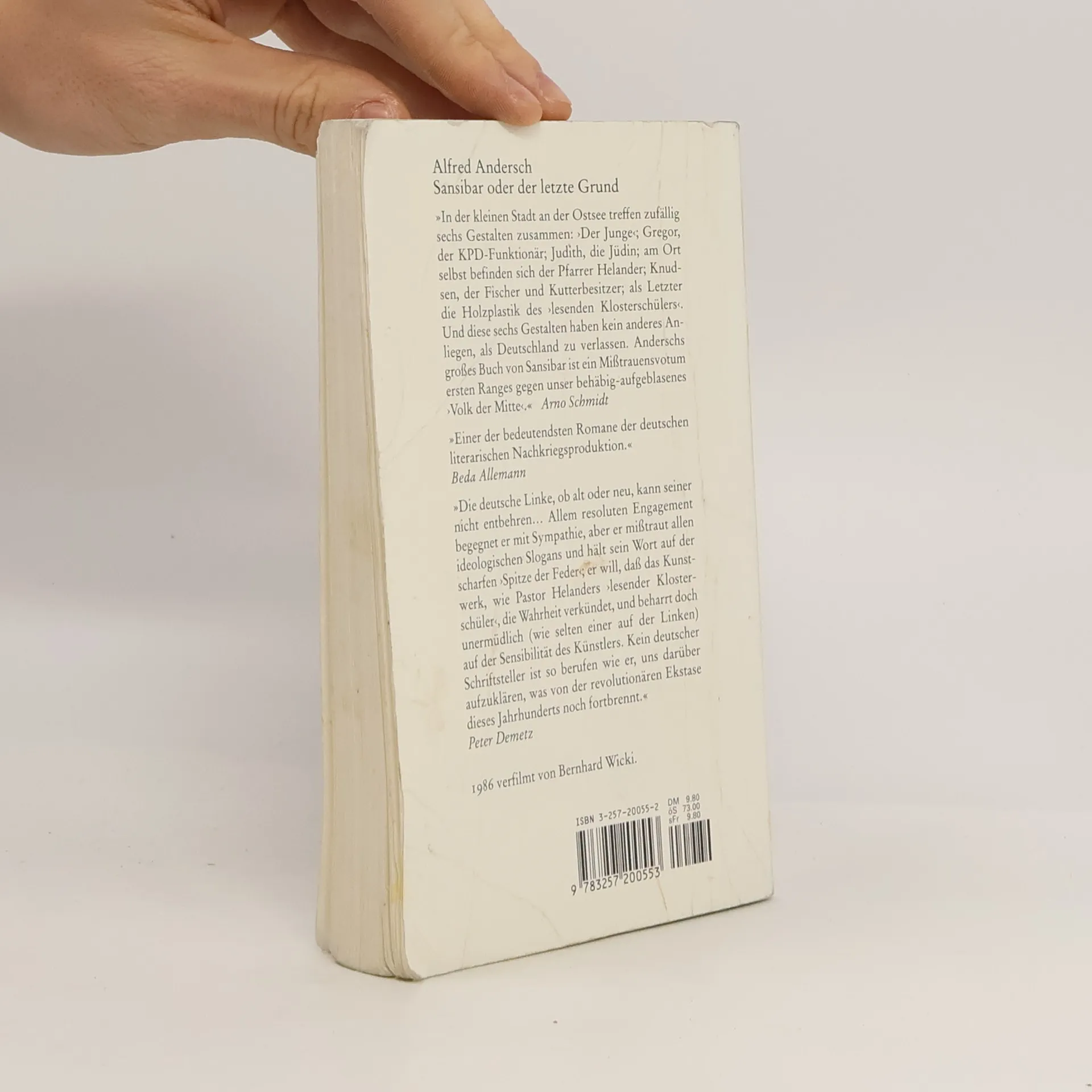 In einer kleinen Stadt an der Ostsee treffen zufällig sechs Gestalten zusammen: ›Der Junge‹; Gregor, der KPD-Funktionär; Judith, die Jüdin; am Ort selbst befinden sich der Pfarrer Helander; Knudsen, der Fischer und Kutterbesitzer; als letzter die Holzplastik des ›Lesenden Klosterschülers‹. Und diese sechs Gestalten haben kein anderes Anliegen, als Deutschland zu verlassen... Alfred Anderschs großes Buch von Sansibar ist ein Mißtrauensvotum ersten Ranges gegen unser behäbig aufgeblasenes ›Volk der Mitte‹.