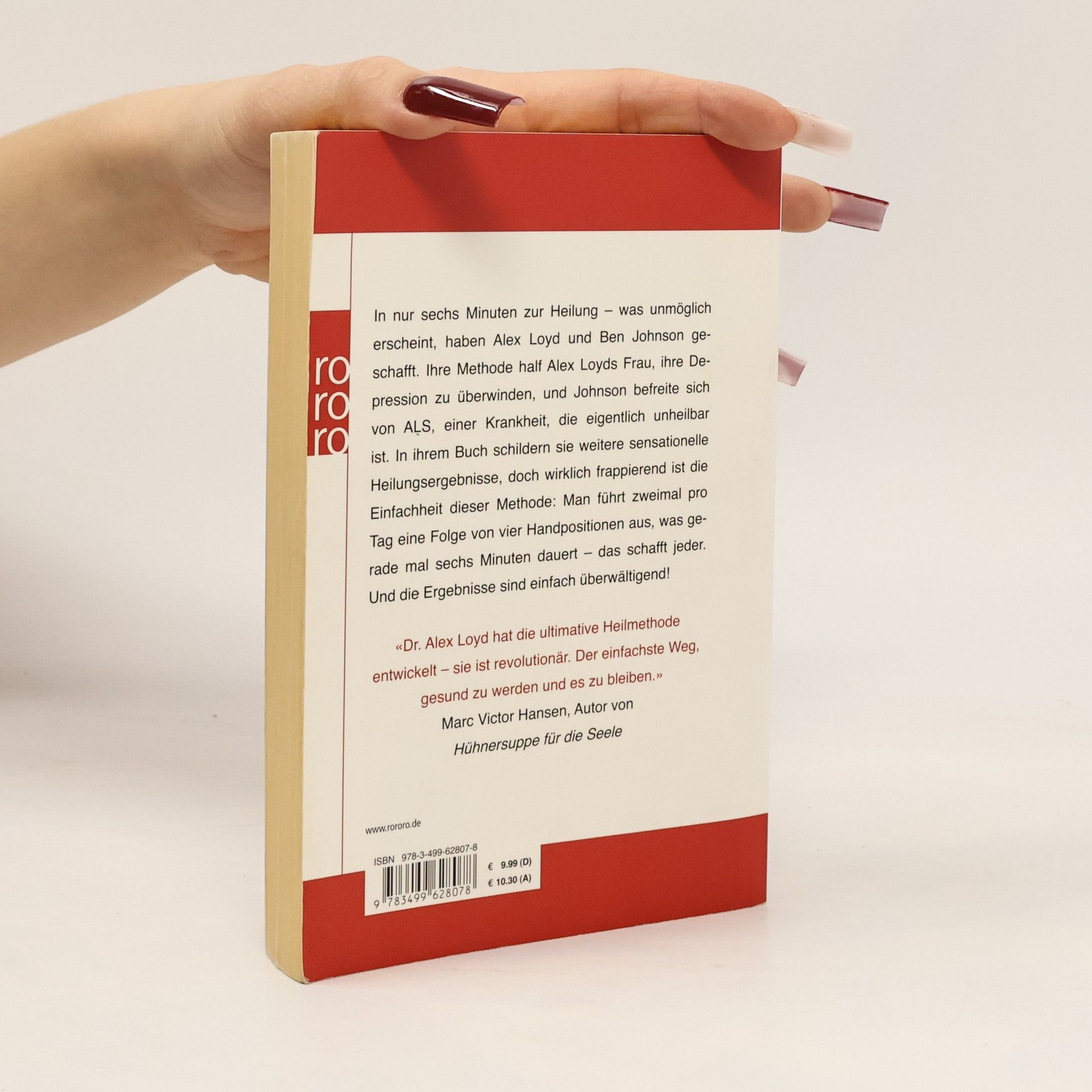 In nur sechs Minuten zur Heilung – was unmöglich erscheint, haben Alex Loyd und Ben Johnson geschafft. Ihre Methode half Alex Loyds Frau, ihre Depression zu überwinden, und Johnson befreite sich von ALS, einer Krankheit, die eigentlich unheilbar ist. In ihrem Buch schildern sie weitere sensationelle Heilungsergebnisse, doch wirklich frappierend ist die Einfachheit dieser Methode: Man führt zweimal pro Tag eine Folge von vier Handpositionen aus, was gerade mal sechs Minuten dauert – das schafft jeder. Und die Ergebnisse sind einfach überwältigend!«Dr. Alex Loyd hat die ultimative Heilmethode entwickelt – sie ist revolutionär. Der einfachste Weg, gesund zu werden und es zu bleiben.» Marc Victor Hansen, Autor von Hühnersuppe für die Seele