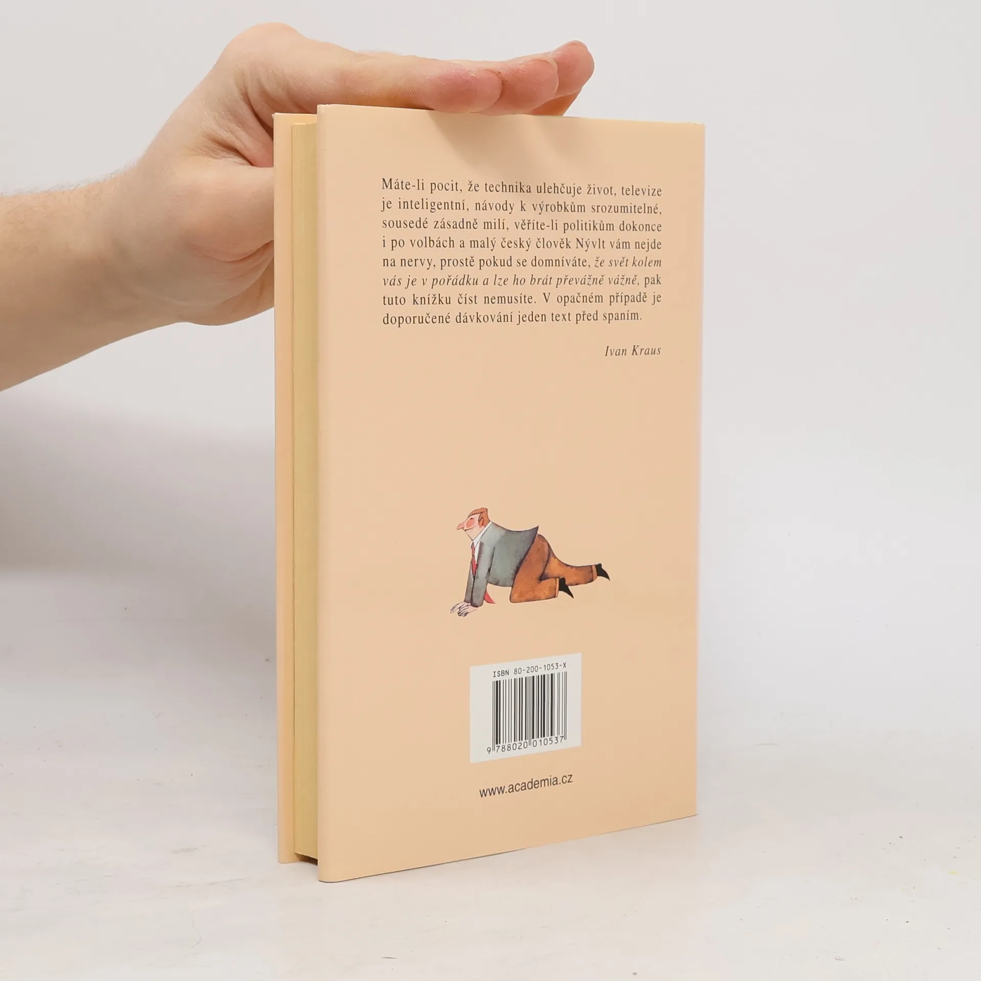 Máte-li pocit, že technika ulehčuje život, televize je inteligentní, návody k výrobkům srozumitelné, sousedé zásadně milí, věříte-li politikům dokonce i po volbách a malý český člověk Nývlt vám nejde na nervy, prostě pokud se domníváte, že svět kolem vás je v pořádku a lze ho brát převážně vážně, pak tuto knížku číst nemusíte. V opačném případě je doporučené dávkování jeden text před spaním.