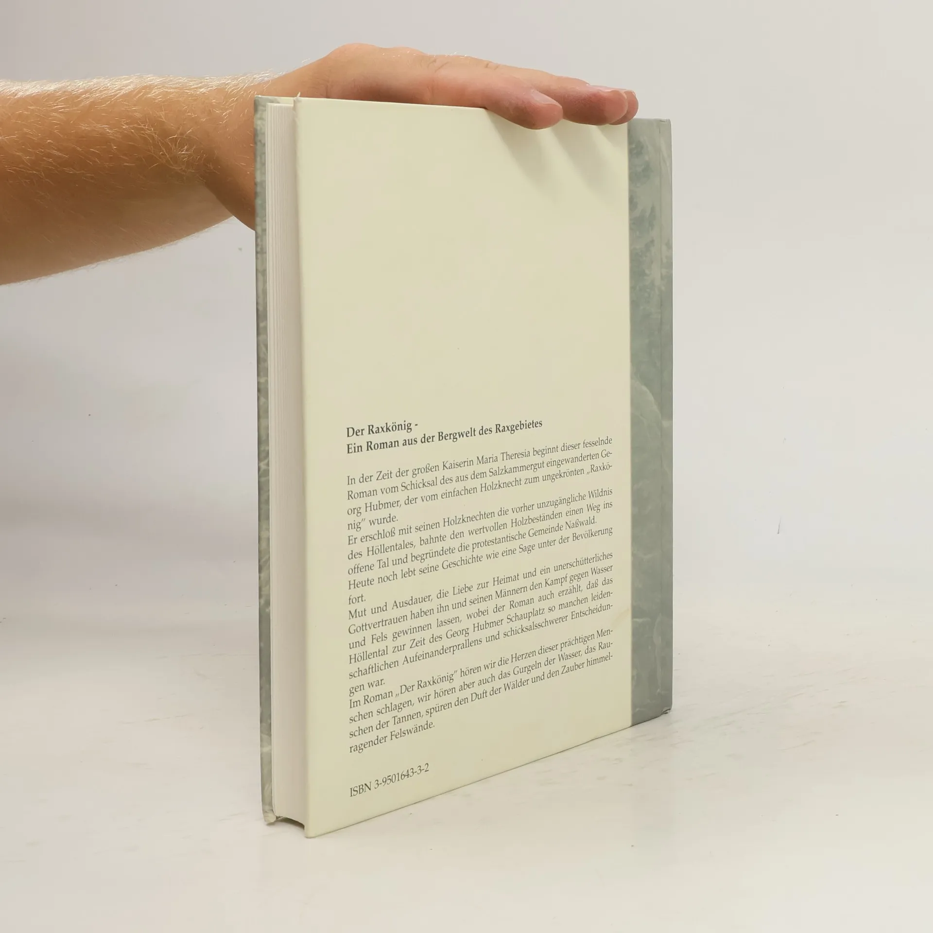 Ein Roman aus der Bergwelt des Raxgebietes In der Zeit der großen Kaiserin Maria Theresia beginnt dieser fesselnde Roman vom Schicksal des aus dem Salzkammergut eingewanderten Georg Hubmer, der vom einfachen Holzknecht zum ungekrönten „Raxkönig“ wurde. Er erschloss mit seinen Holzknechten die vorher unzugängliche Wildnis des Höllentales, bahnte den wertvollen Holzbeständen einen Weg ins offene Tal und begründete die protestantische Gemeinde Naßwald. Heute noch lebt seine Geschichte wie eine Sage in der Bevölkerung fort. Mut und Ausdauer, die Liebe zur Heimat und ein unerschütterliches Gottvertrauen haben ihn und seinen Männern den Kampf gegen Wasser und Fels gewinnen lassen, wobei der Roman auch erzählt, dass das Höllental zur Zeit des Georg Hubmer Schauplatz so manchen leidenschaftlichen Aufeinanderprallens und schicksalsschwerer Entscheidungen war. Im Roman „Der Raxkönig“ hören wir aber auch das Gurgeln der Wasser, das Rauschen der Tannen, spüren den Duft der Wälder und den Zauber himmelragender Felswände.