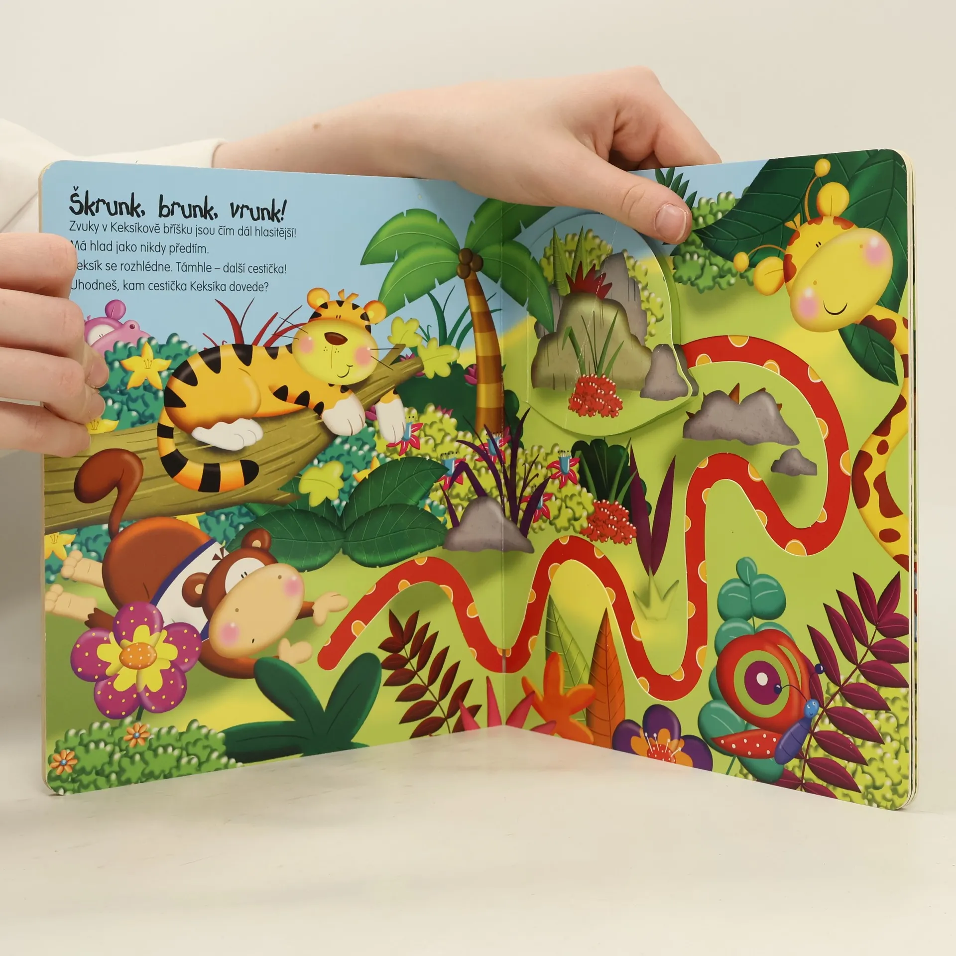 Pomoz opičákovi Keksíkovi najít něco k snědku! Putuj prstem po cestičkách v knížce a otvírej okénka, pod kterými se ukrývají různá překvapení!