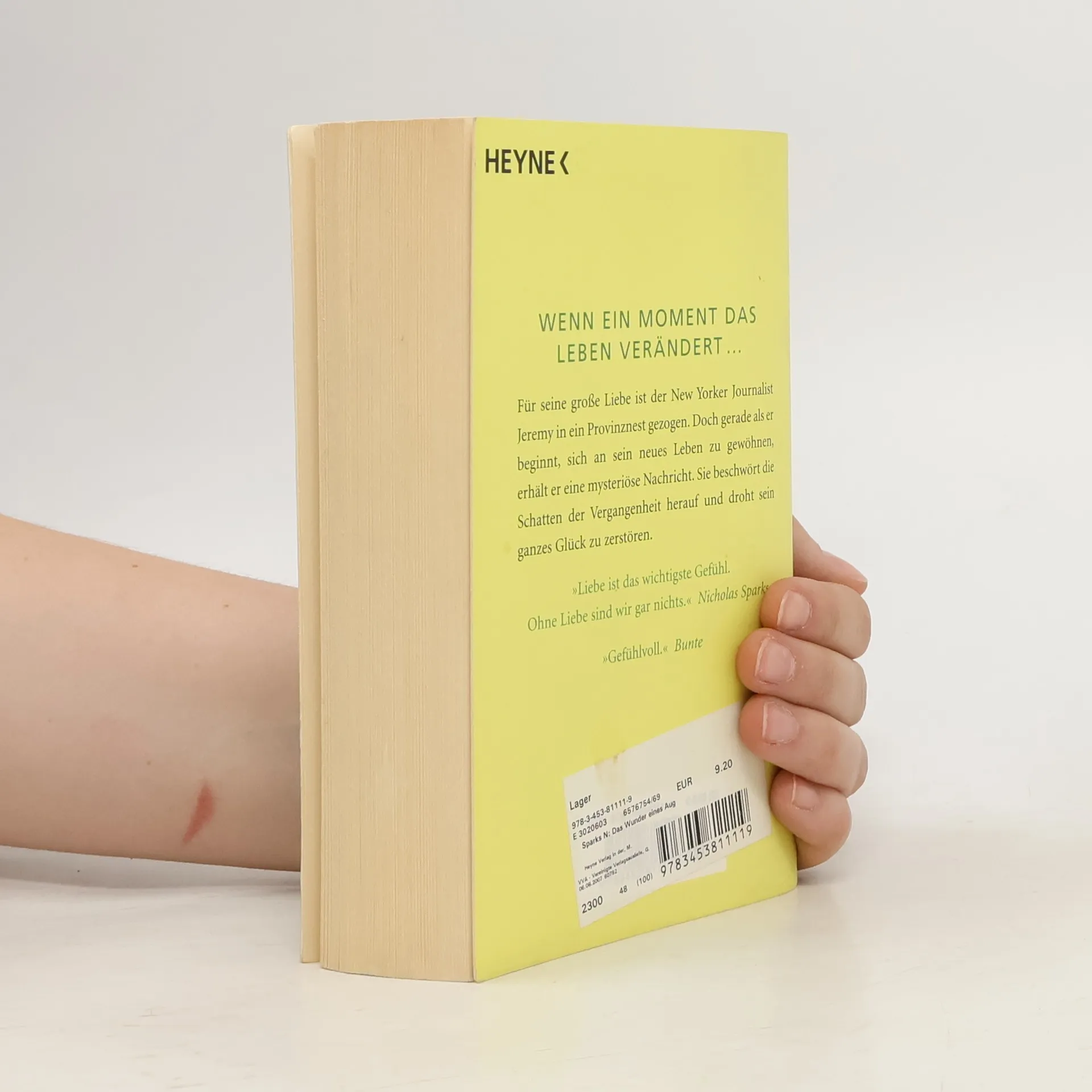 „Ohne Liebe sind wir gar nichts.“ Nicholas Sparks Wenn ein Moment das Leben verändert ... Für seine große Liebe ist der New Yorker Jeremy in ein Provinznest gezogen. Doch gerade als er beginnt, sein neues Leben zu genießen, erhält er eine mysteriöse Nachricht, die die Schatten der Vergangenheit heraufbeschwört und sein ganzes Glück zu zerstören droht. Jeremy Marsh war sich seiner Sache ganz sicher gewesen: Nie mehr würde er seinem Herzen folgen, nie New York verlassen – und vor allem niemals Vater werden. Doch nun sitzt er plötzlich mit Lexie, der Liebe seines Lebens, im abgeschiedenen Örtchen Boone Creek und freut sich auf die Geburt seiner Tochter. Alles scheint perfekt – wären da nur nicht die Zweifel, die an Jeremy nagen: Lexie war für ihn Liebe auf den ersten Blick, aber kennt er sie wirklich? Und kann er sich ihrer Gefühle auch im grauen Alltag und in schlechten Zeiten sicher sein? Da erhält Jeremy eine anonyme Nachricht, die alte Wunden wieder aufreißt und ihm den Boden unter den Füßen wegzieht. Sein Glück steht plötzlich auf dem Spiel.
