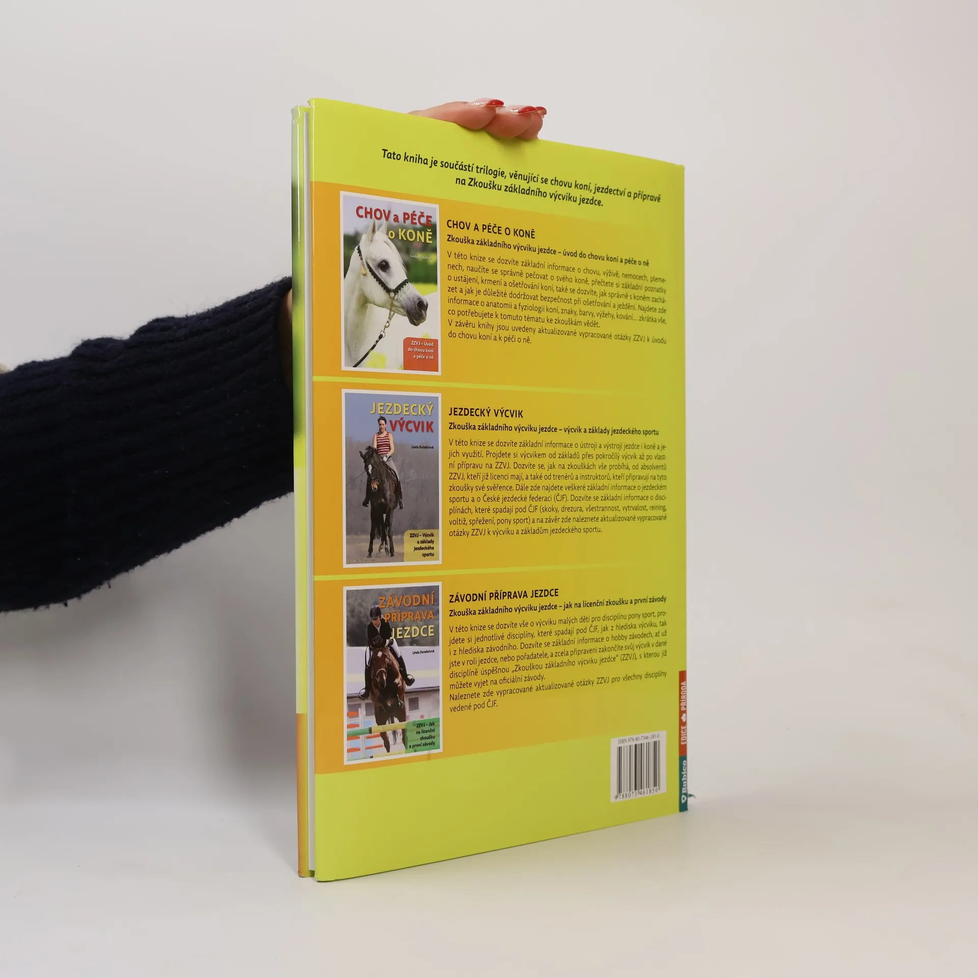 Zkouška základního výcviku jezdce - úvod do chovu koní a péče o ně V této knize se dozvíte základní informace o chovu, výživě, nemocech, plemenech, naučíte se správně pečovat o svého koně, přečtete si základní poznatky o ustájení, krmení a ošetřování koní, také se dozvíte, jak správně s koněm zacházet a jak je důležité dodržovat bezpečnost při ošetřování a ježdění. Najdete zde informace o anatomii a fyziologii koní, znaky, barvy, výžehy, kování... zkrátka vše, co potřebujete k tomuto tématu ke zkouškám vědět. V závěru knihy jsou uvedeny aktualizované vypracované otázky ZZVJ k úvodu do chovu koní a k péči o ně.