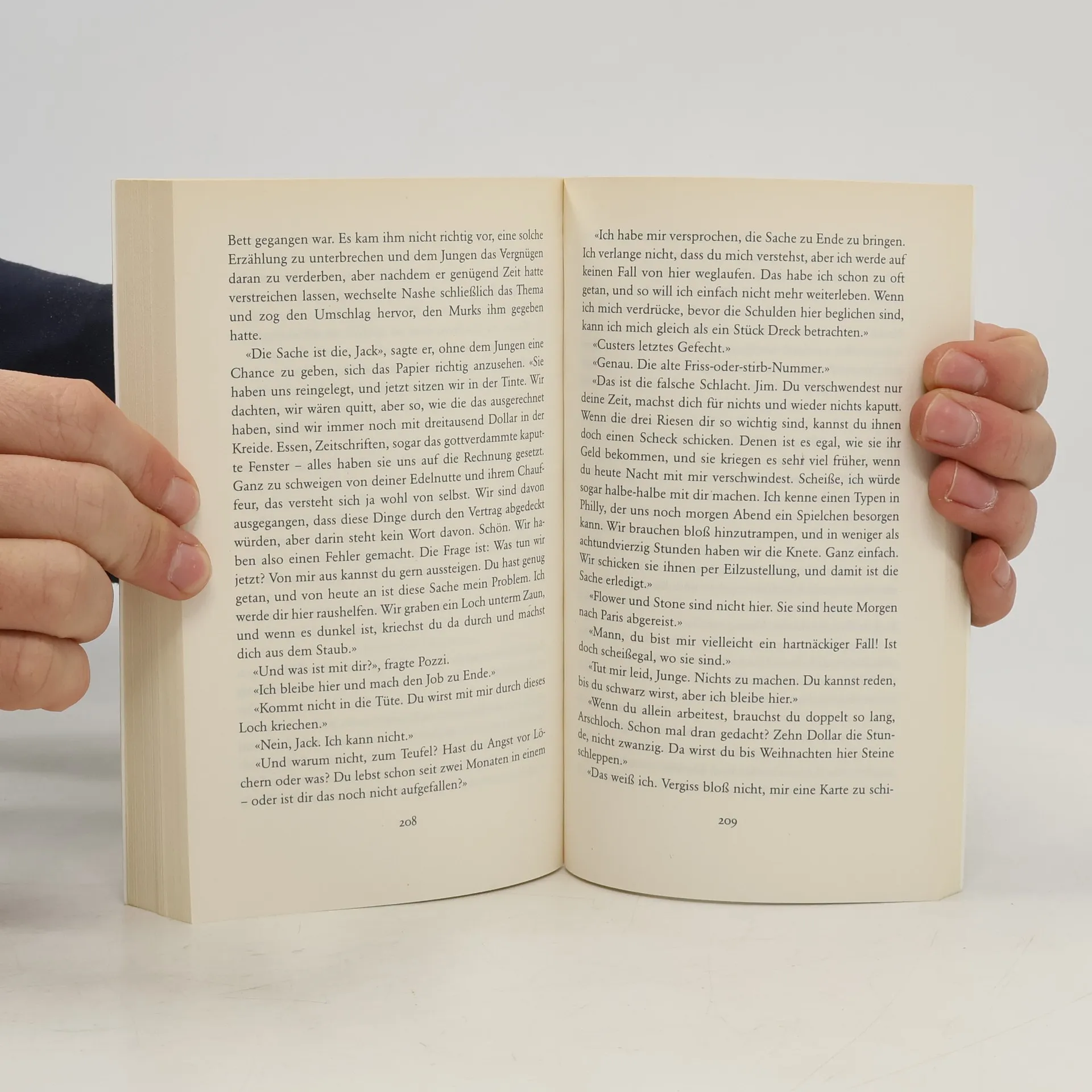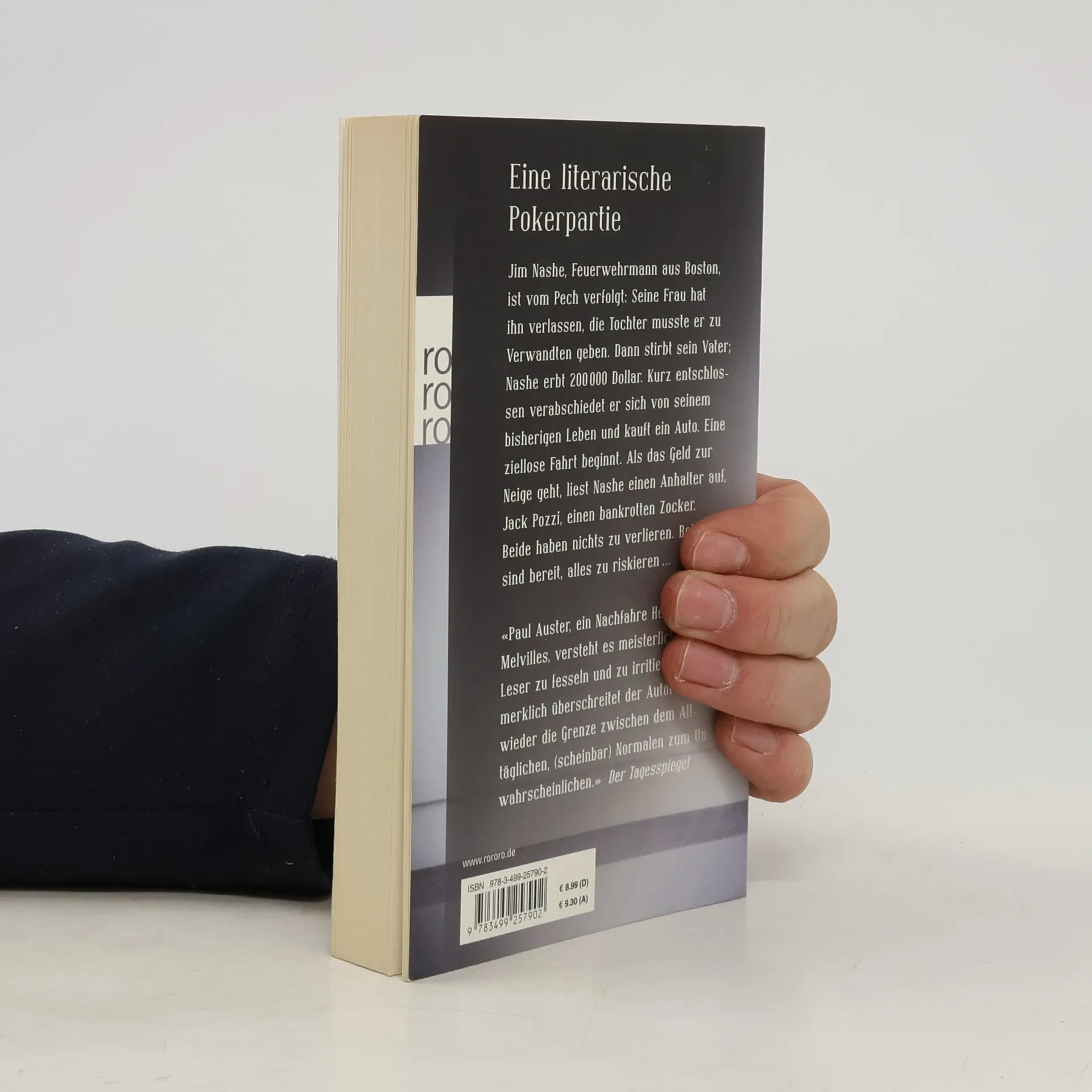 Eine literarische Pokerpartie Jim Nashe, Feuerwehrmann aus Boston, ist vom Pech verfolgt: Seine Frau hat ihn verlassen, die Tochter musste er zu Verwandten geben. Dann stirbt sein Vater; Nashe erbt 200 000 Dollar. Kurz entschlossen verabschiedet er sich von seinem bisherigen Leben und kauft ein Auto. Eine ziellose Fahrt beginnt. Als das Geld zur Neige geht, liest Nashe einen Anhalter auf, Jack Pozzi, einen bankrotten Zocker. Beide haben nichts zu verlieren. Beide sind bereit, alles zu riskieren ... «Paul Auster, ein Nachfahre Herman Melvilles, versteht es meisterlich, seine Leser zu fesseln und zu irritieren. Unmerklich überschreitet der Autor immer wieder die Grenze zwischen dem Alltäglichen, (scheinbar) Normalen zum Unwahrscheinlichen.» Der Tagesspiegel